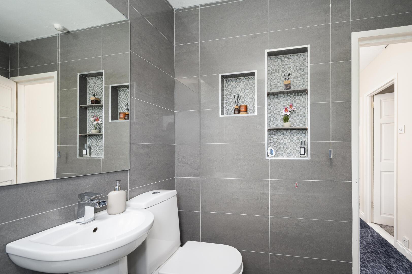 Family Bathroom - Modern white suite comprising low flush WC with push button, pedestal wash hand basin and chrome mixer taps, panelled bath with chrome mixer taps, thermostatically controlled valve, telephone hand unit, fully tiled walls, ceramic tiled floor, frosted glass window, low voltage recessed spotlighting and chrome heated towel rail, built-in storage cupboard with additional shelving.