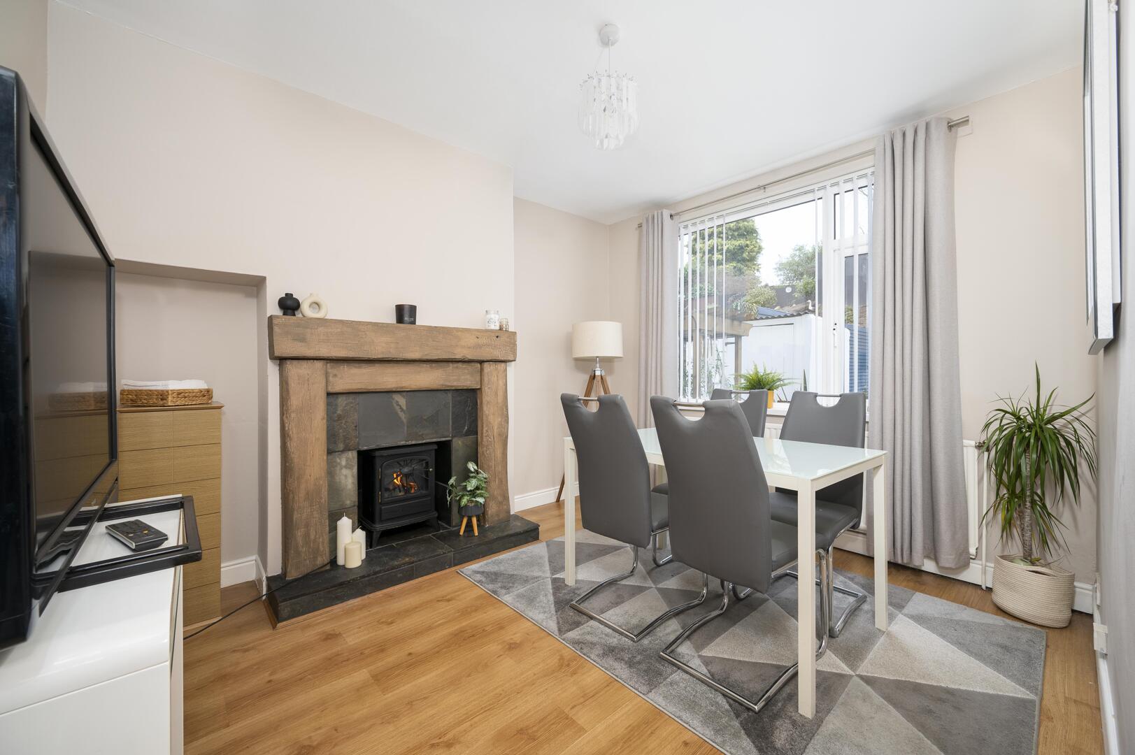 Dining Room - 12'0" x 10'5" - Outlook to rear, laminate wooden floor, wooden fireplace with tiled inset and hearth (open fire currently not in use).