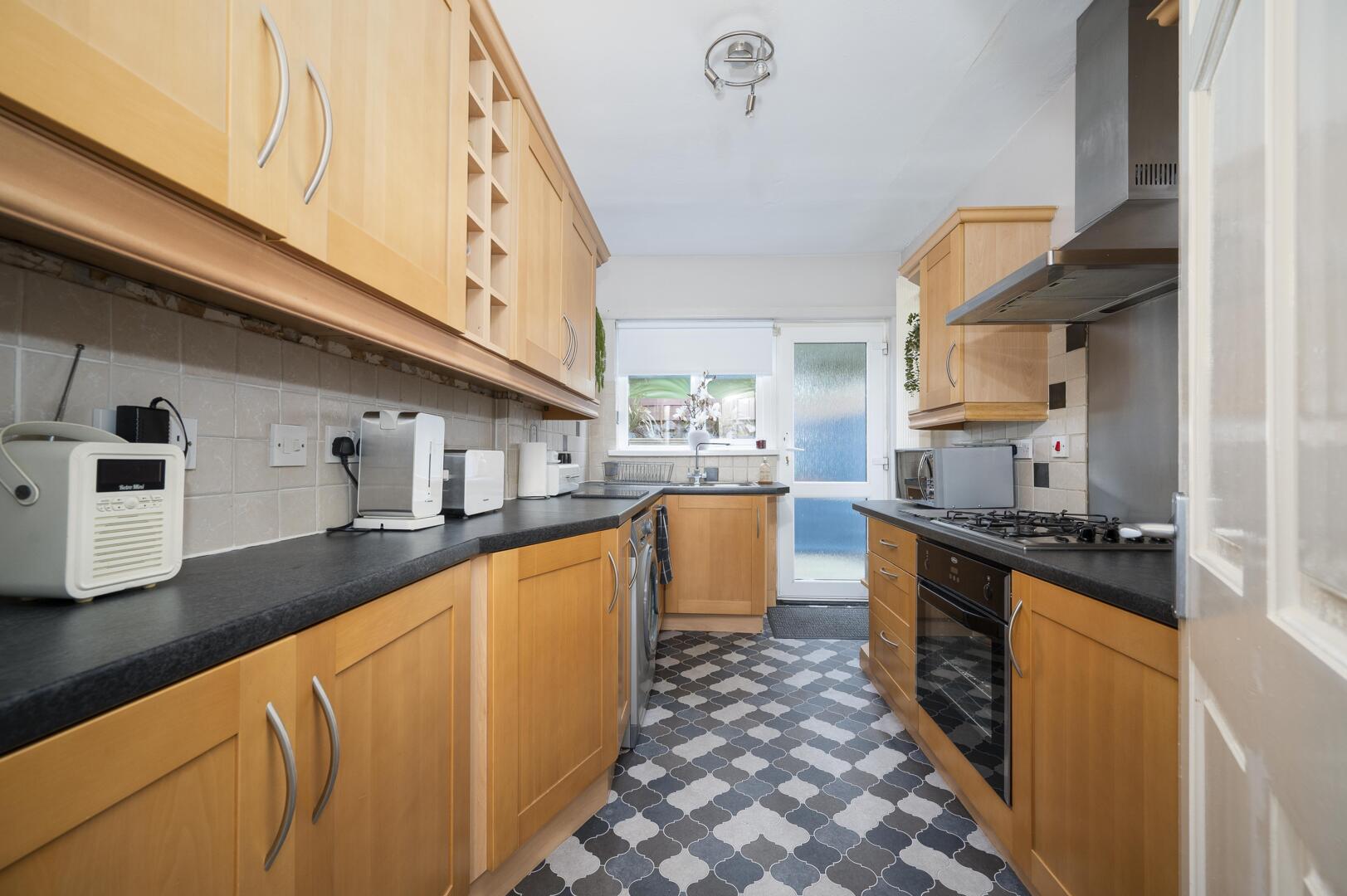 Kitchen - 13'6" x 7'3" - With excellent range of high and low level units, stainless steel fittings, laminate worktop, stainless steel sink and a half with chrome mixer tap, built-in low level oven, four ring stainless steel gas hob, stainless steel extractor hood above and stainless steel splashback, part tiled walls, integrated dishwasher, plumbed for washing machine, space for fridge freezer, vinyl flooring, outlook to rear, modern vertical radiator and uPVC double glazed access door to rear garden.