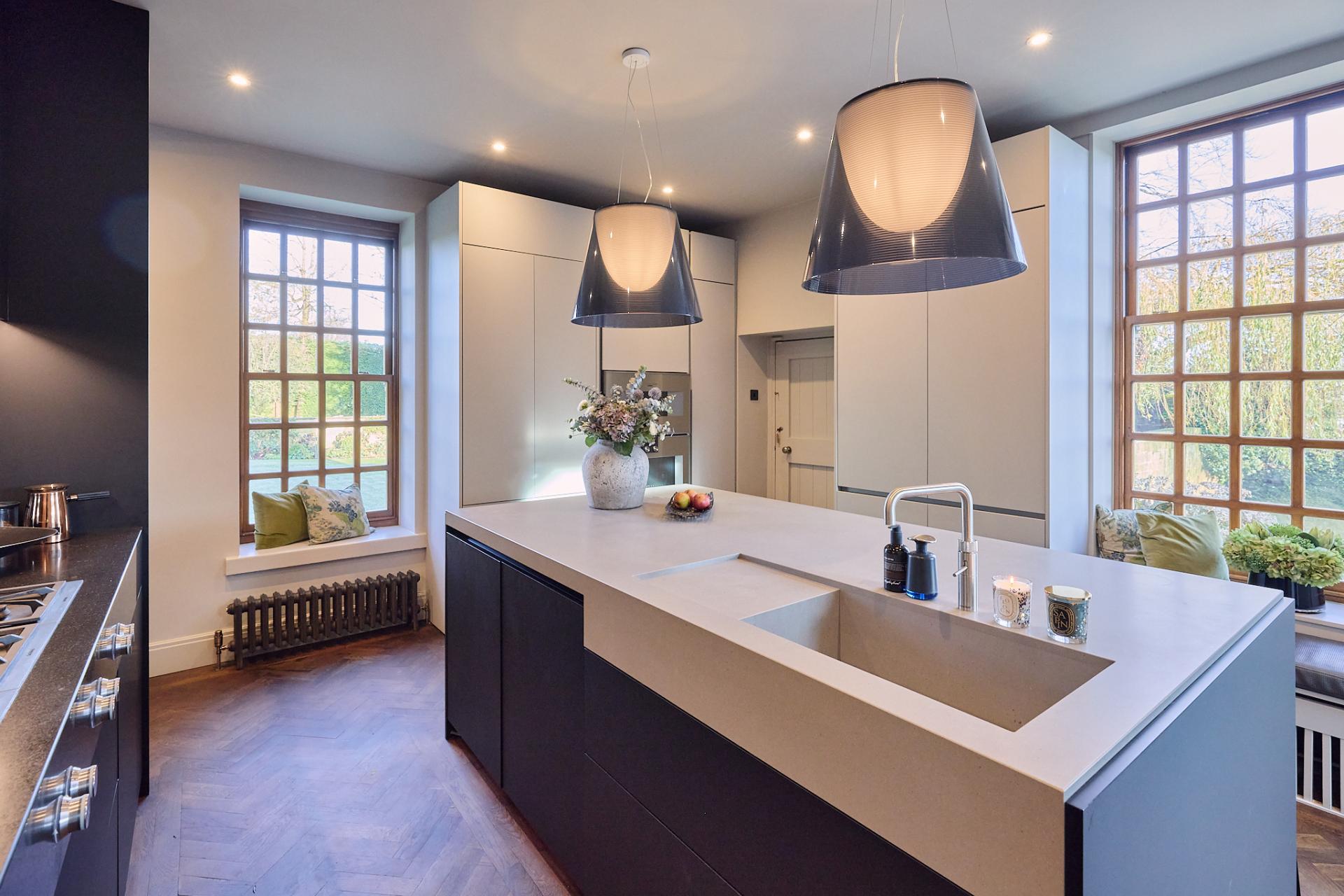 Continue through the snug and you’ll reach the kitchen which occupies the east wing of the property. This superb space has undergone an extensive renovation to transform the farmhouse heart of the home into a jaw-dropping contemporary masterpiece, leaving no detail untouched.