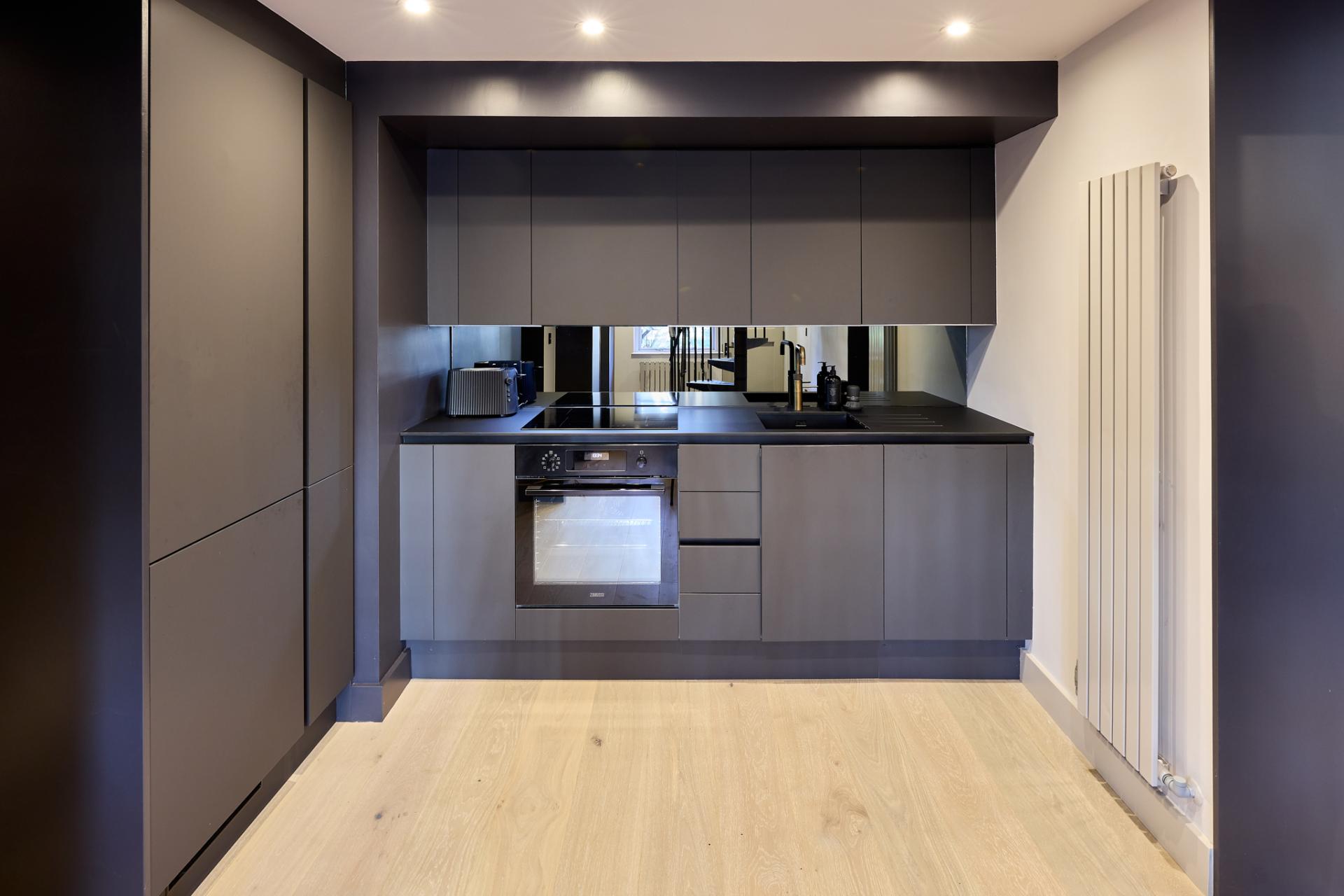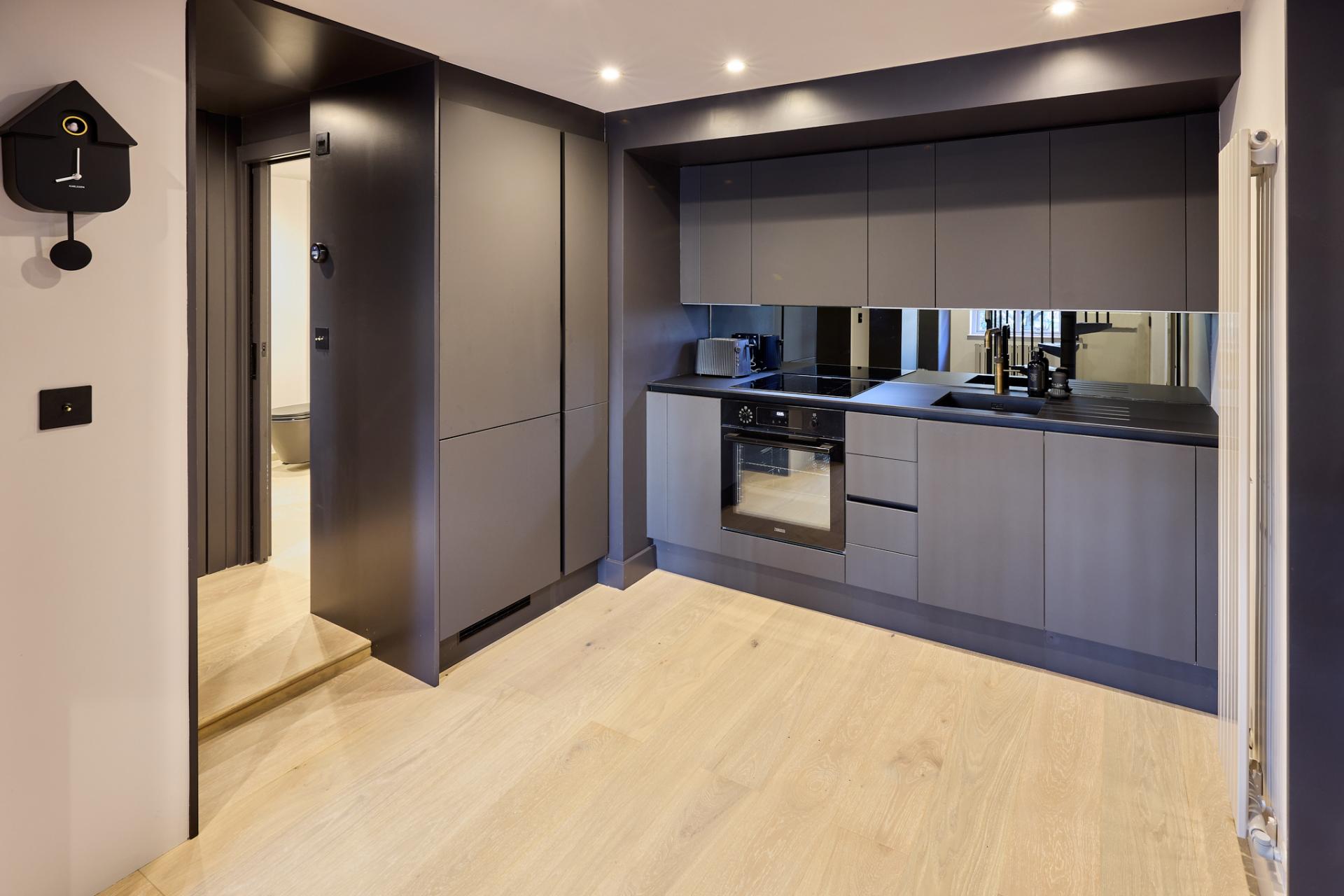 Punctuated with dual-aspect windows, you’ll find further full-length wall units housing hi-spec appliances from Miele and Gaggenau, contrasted with intricate parquet oak flooring to retain a glimpse of the home’s period charm.