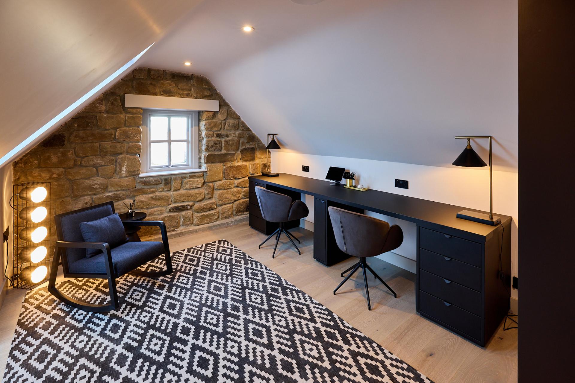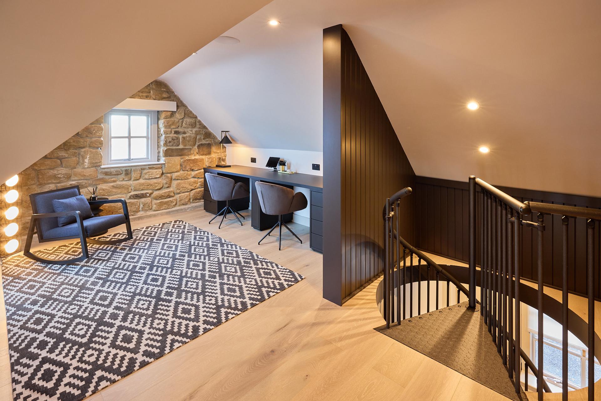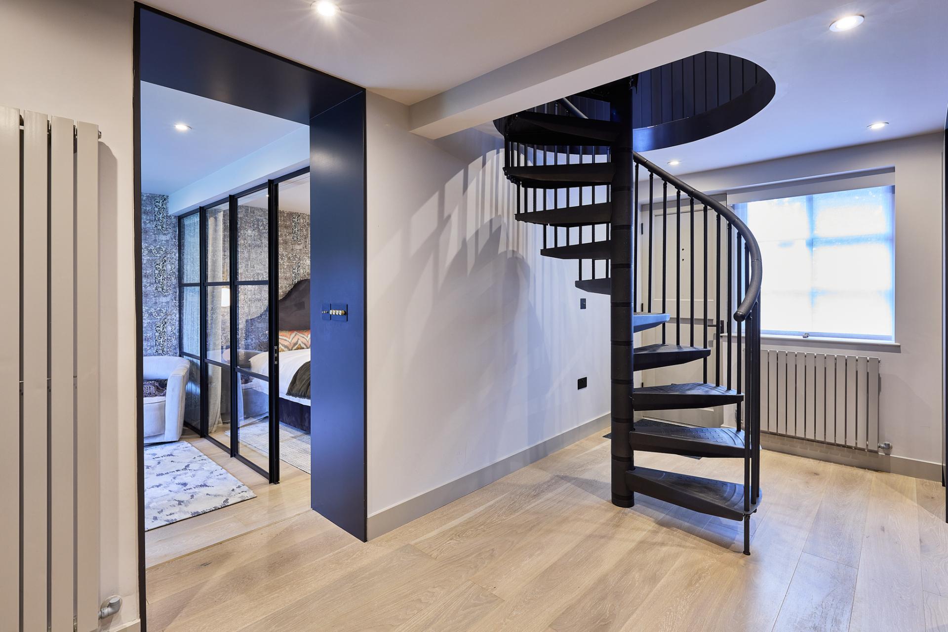 A statement black spiral staircase leads you to the first floor which is designed within the apex of the roof to maximise on space. Here you’ll find a versatile luxury office which could be reconfigured as a further reception room.