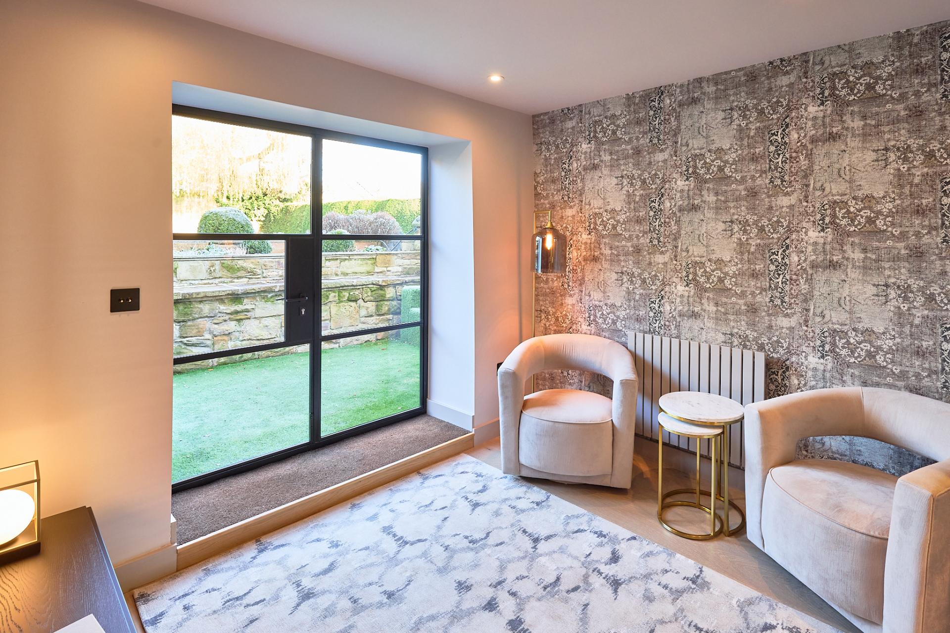 The lounge is the more spacious of the two and takes the role of the formal entertainment space thanks to its double chandeliers and ornate coving, finished with beautiful panelled walls adding to the stately home feel.