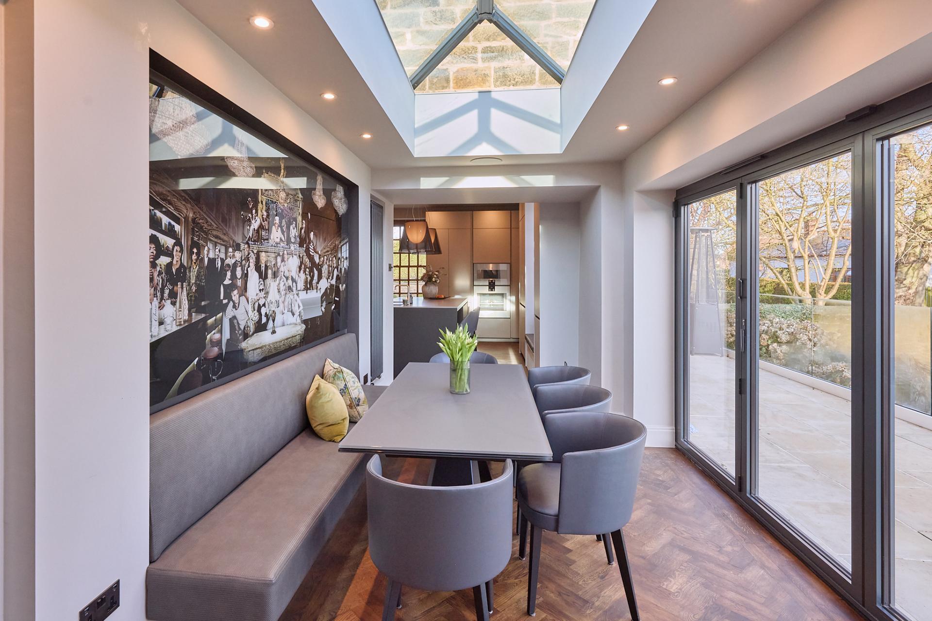 Following the L-shaped footprint, the kitchen flows seamlessly into the dining room flooded with natural light from the pitched skylight overhead and full width bi-fold doors that open out onto a raised patio. Concealed beyond this is the utility area housing the laundry appliances, conveniently tucked away from the main hub.