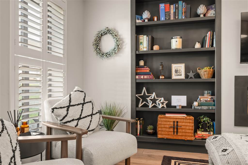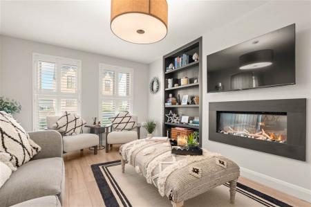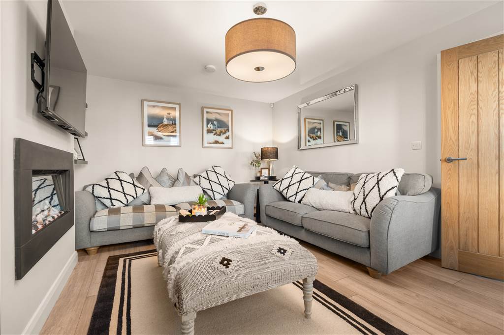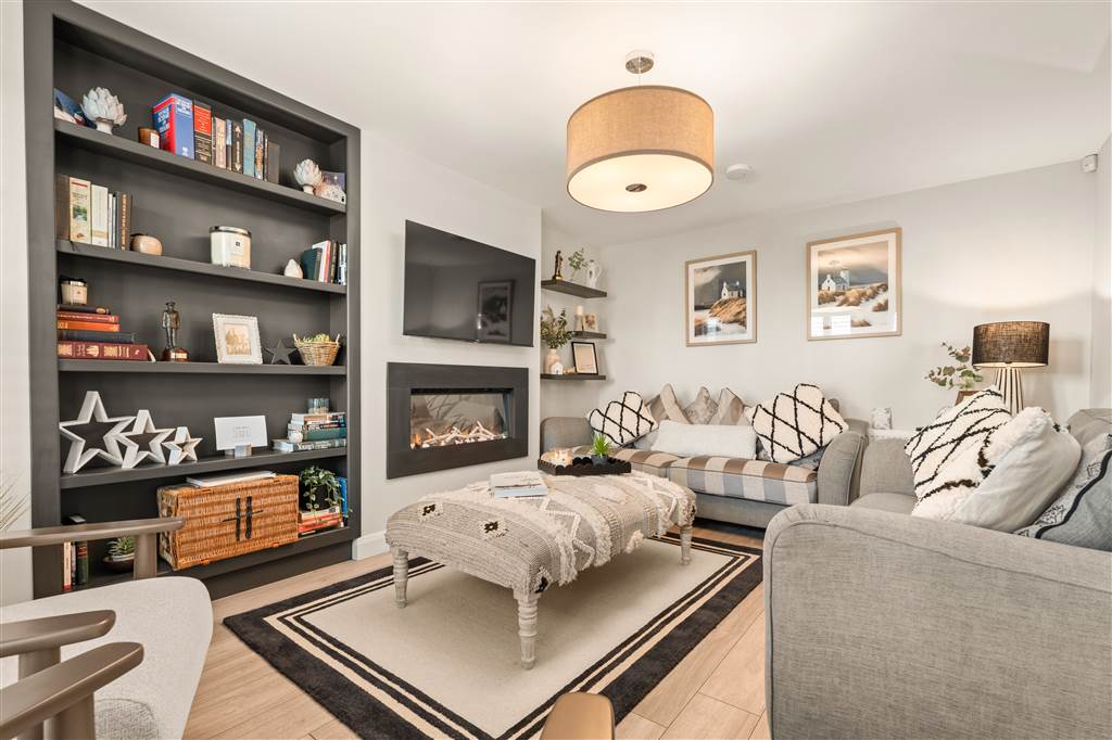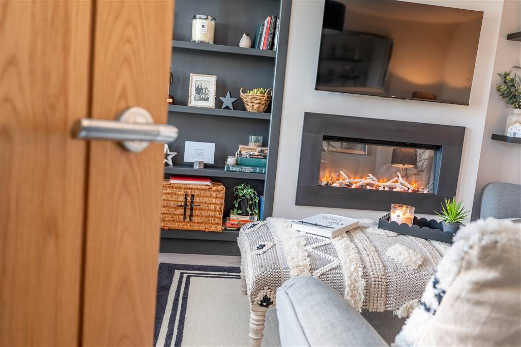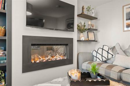 - Living room with wall-mounted fireplace