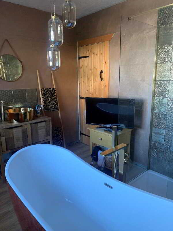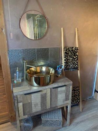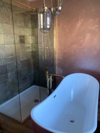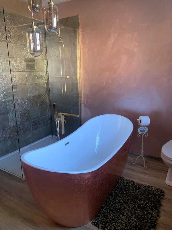 - The same including the feature free standing copper effect bath, brass effect vanity unit and a large shower in contemporary tiling.