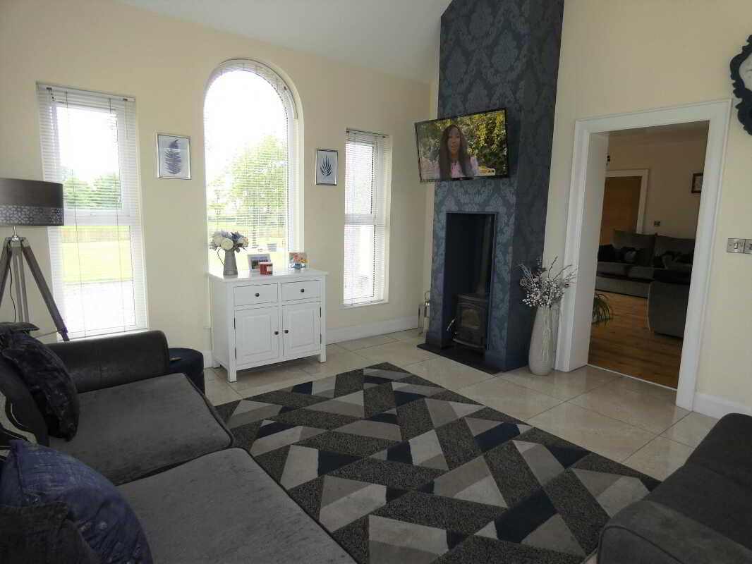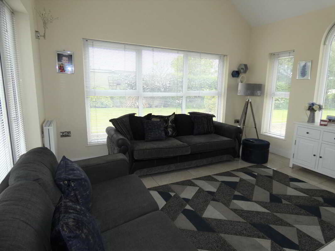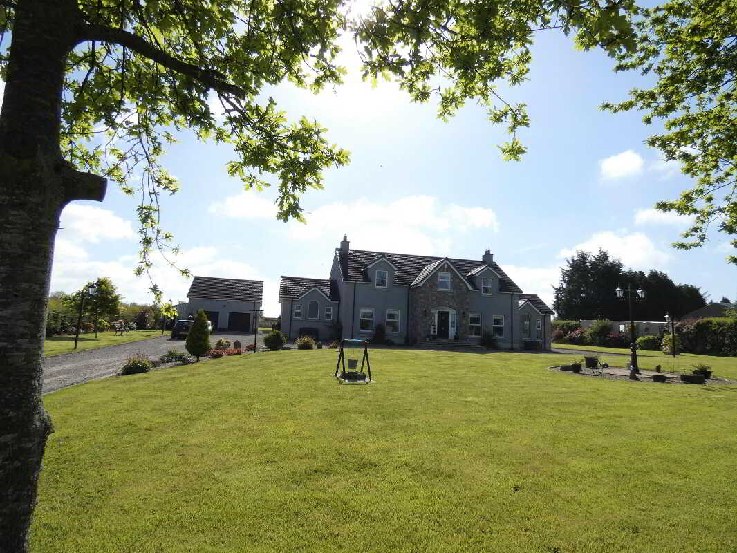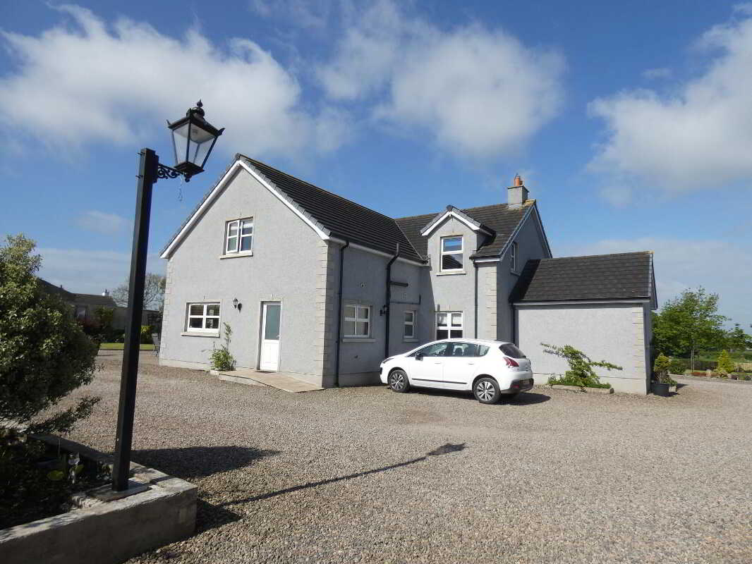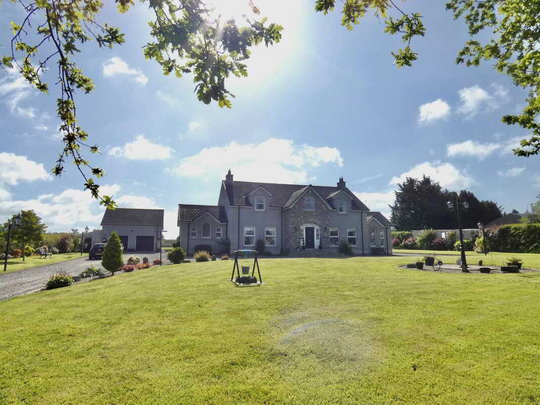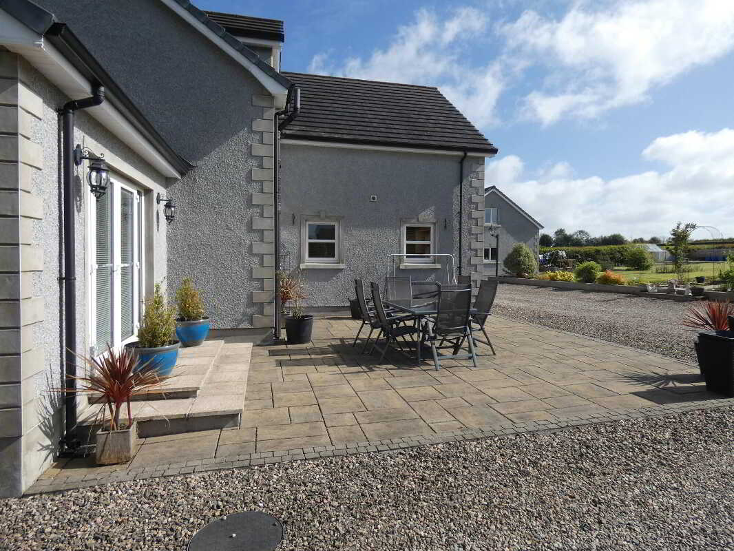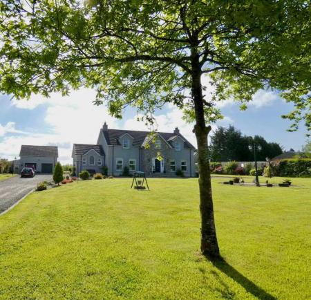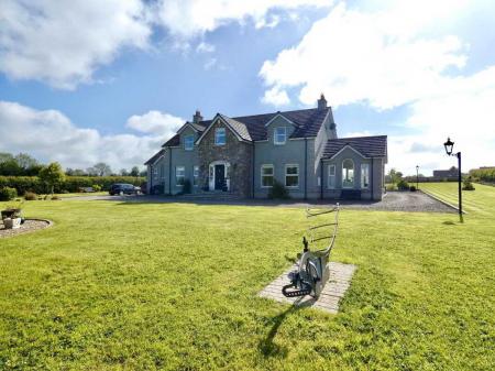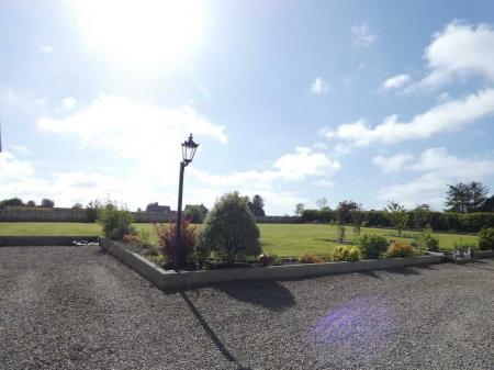 uPVC fascia and soffits with soffit downlights to front on the property.Set on grounds in excess of 1 acre.Stoned driveway with entrance pillars.Extensive stoned parking areas to front, side and rear of the property.Spacious patio area to side/rear of property.Landscaped garden areas to front, side and rear of the property.Outside tap to rear of the property.Outside lights to front, side and rear of the property.
