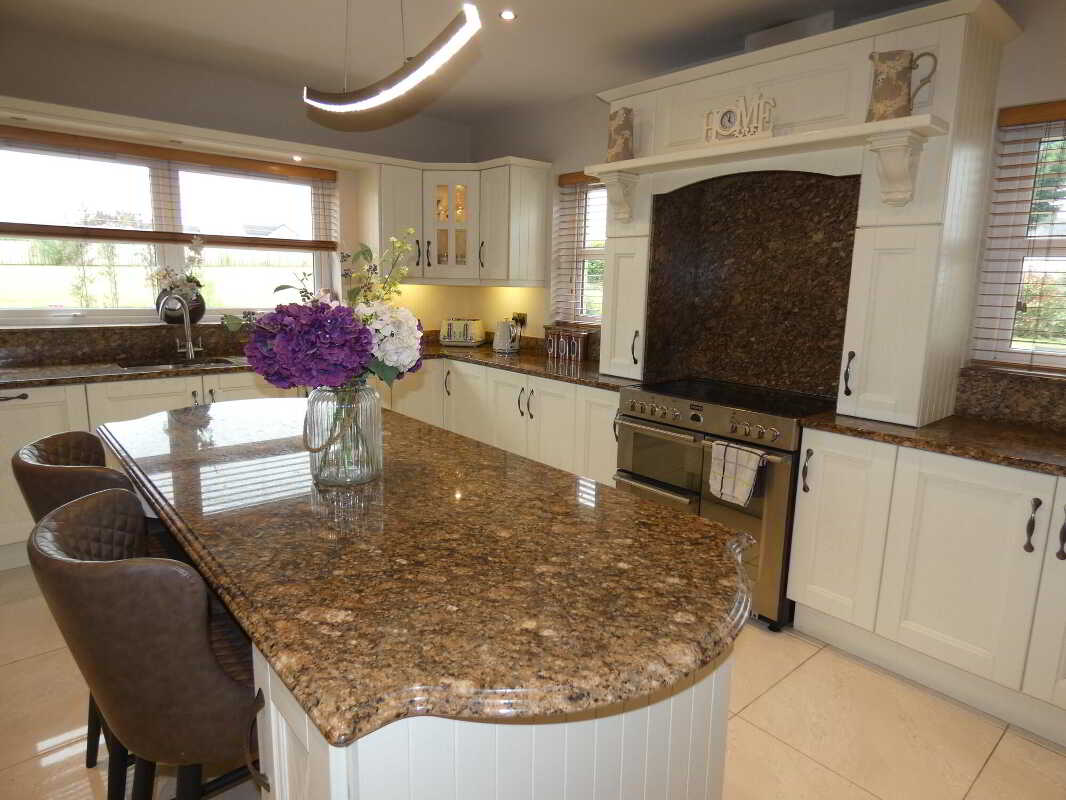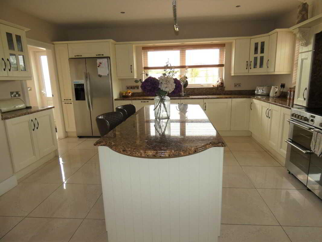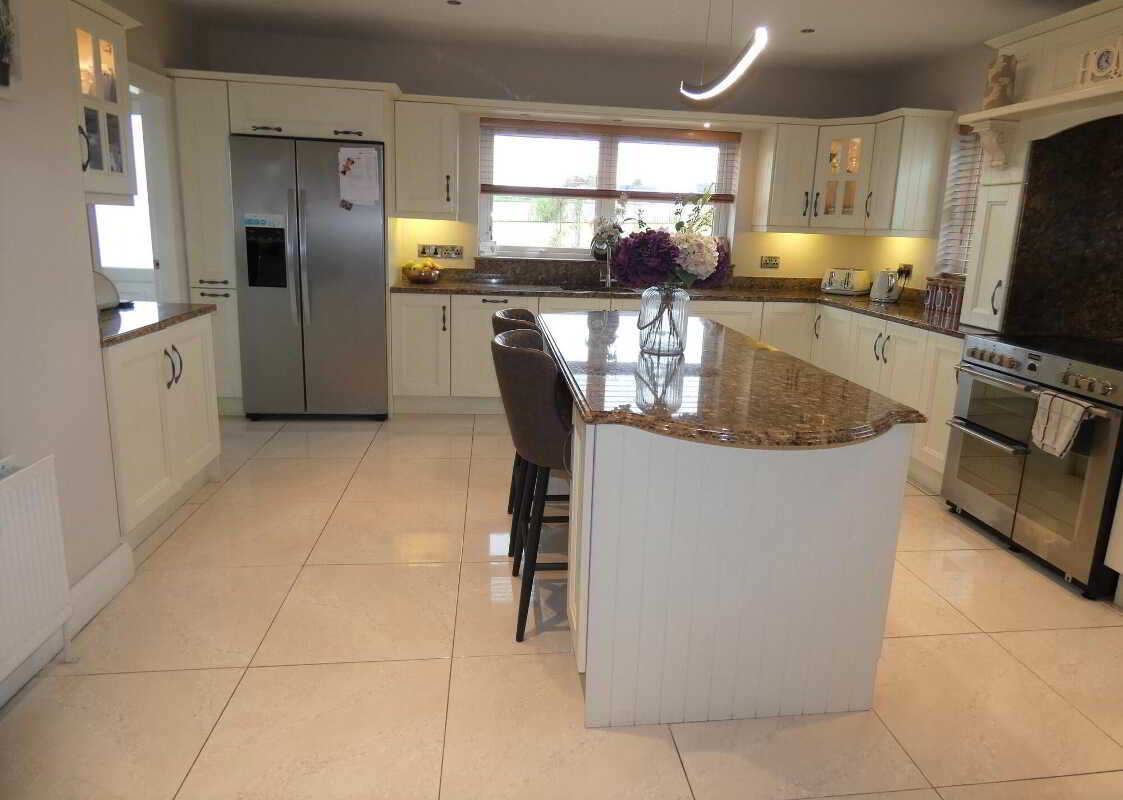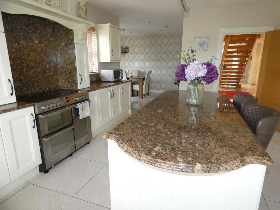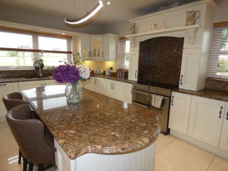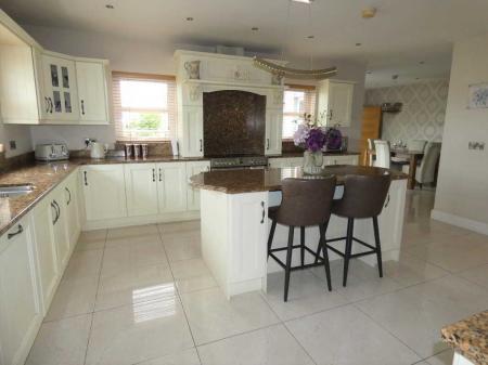 With an attractive Orlee hand painted eye and low level units including stoves electric cooker with ceramic hob, 2 ovens and a grill, extractor fan, 1 ½ bowl stainless steel sink unit, integrated dishwasher, Kenwood American style fridge freezer with ice machine, window pelmet with downlights, pull out larder, lighted glass display units, granite worktop, granite splashback, feature centre island with storage cupboards and drawers, granite worktop, ceiling downlights, T.V. point, tiled floor, open plan to:Dining Area/Room4.78m x 2.9m (15' 8" x 9' 6")
