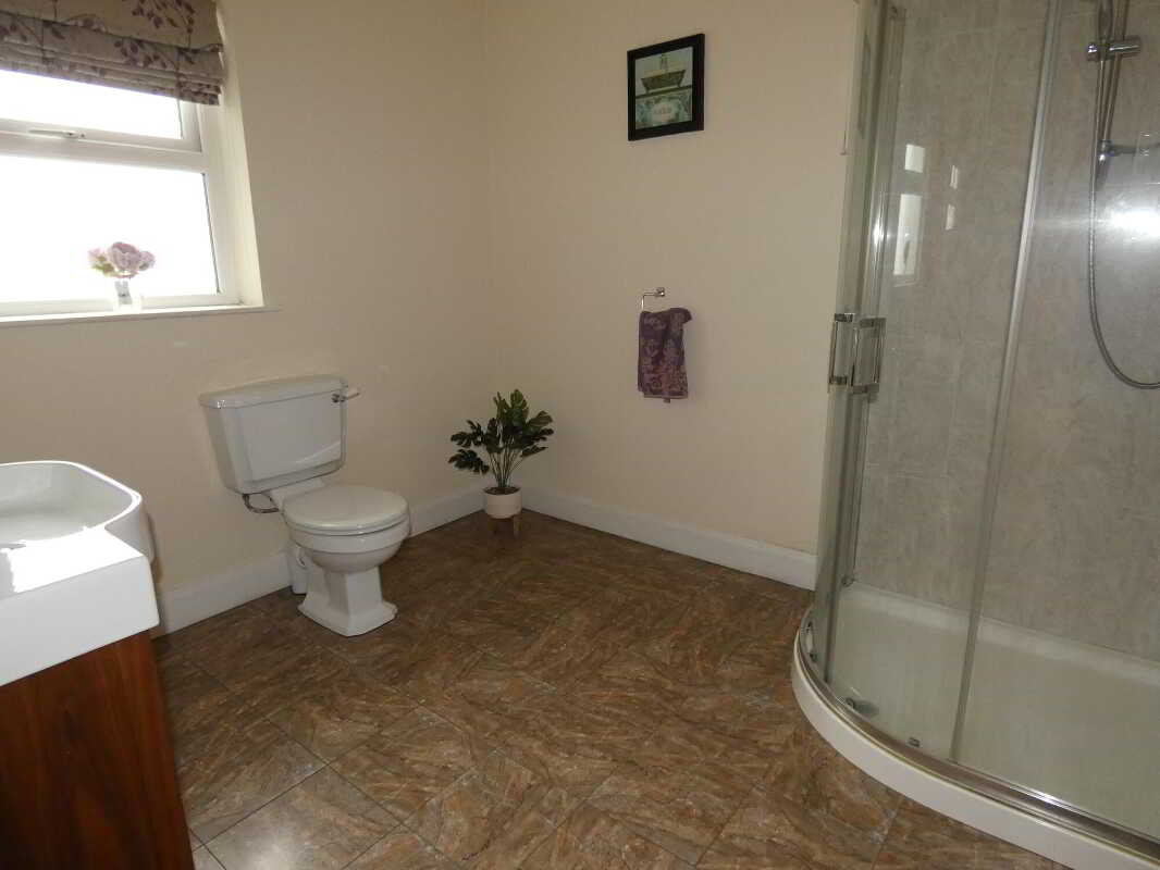 With Redring Expressions 500s electric shower, tiled cubicle, w.c, wash hand basin with storage cupboards and tiled splashback, mirror, tiled floor, ceiling downlights, extractor fan.Bedroom 53.99m x 3.86m (13' 1" x 12' 8")
