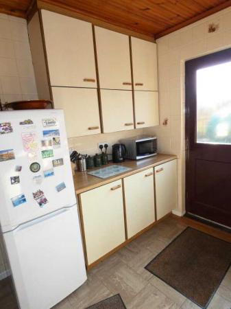 With a range of fitted eye and low level units, tiled between the worktops and the eye level units, stainless steel sink, space for a cooker with an extractor canopy over, feature wood sheeted ceiling, plumbed for an automatic washing machine, tile effect flooring and a partly glazed door to the rear.