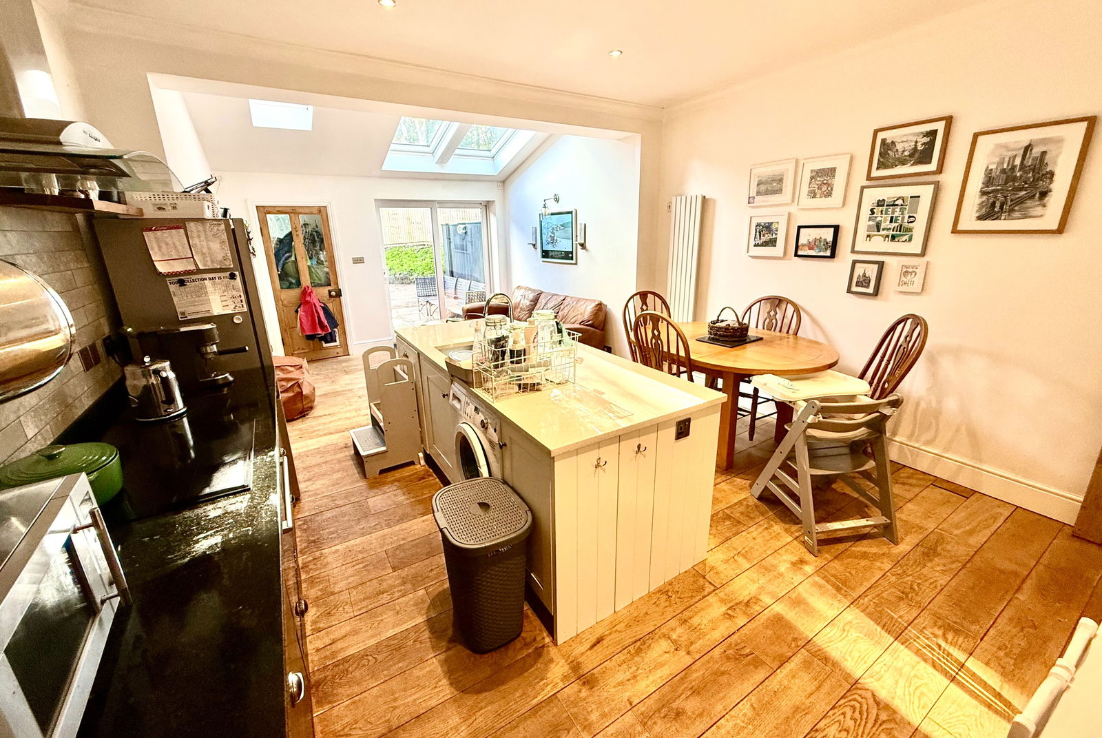 DINING KITCHEN Measuring 13' 9" x 22' 6" (4.19m x 6.86m) Located to the rear aspect of the property, this hub of the home benefits from having a single storey extension that in turn has sliding double glazed patio doors to the rear. Presented with bespoke kitchen furniture comprising a mix of painted and unpainted solid oak units that are topped with solid oak and quartz worktops with a sunk down 1 1/2 bowl sink with mixer tap over. appliances include an integrated double oven, five ring hob with an extractor hood over, integrated dishwasher, free standing space for a fridge freezer and the room is finished with tiling to the splash backs, oak flooring, coving to he ceiling, inset spot lighting and ample space for a family dining table. The extension has three Velux style lights to the ceiling, two modern upright radiators and a doorway providing access to the rear porch and to the cellar.