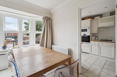 The inviting double aspect living/dining area is enhanced by large windows that flood the space with natural light, complemented by modern decor. French doors and a Juliette balcony create an effortless connection to the outdoors and ensure good levels of natural light.