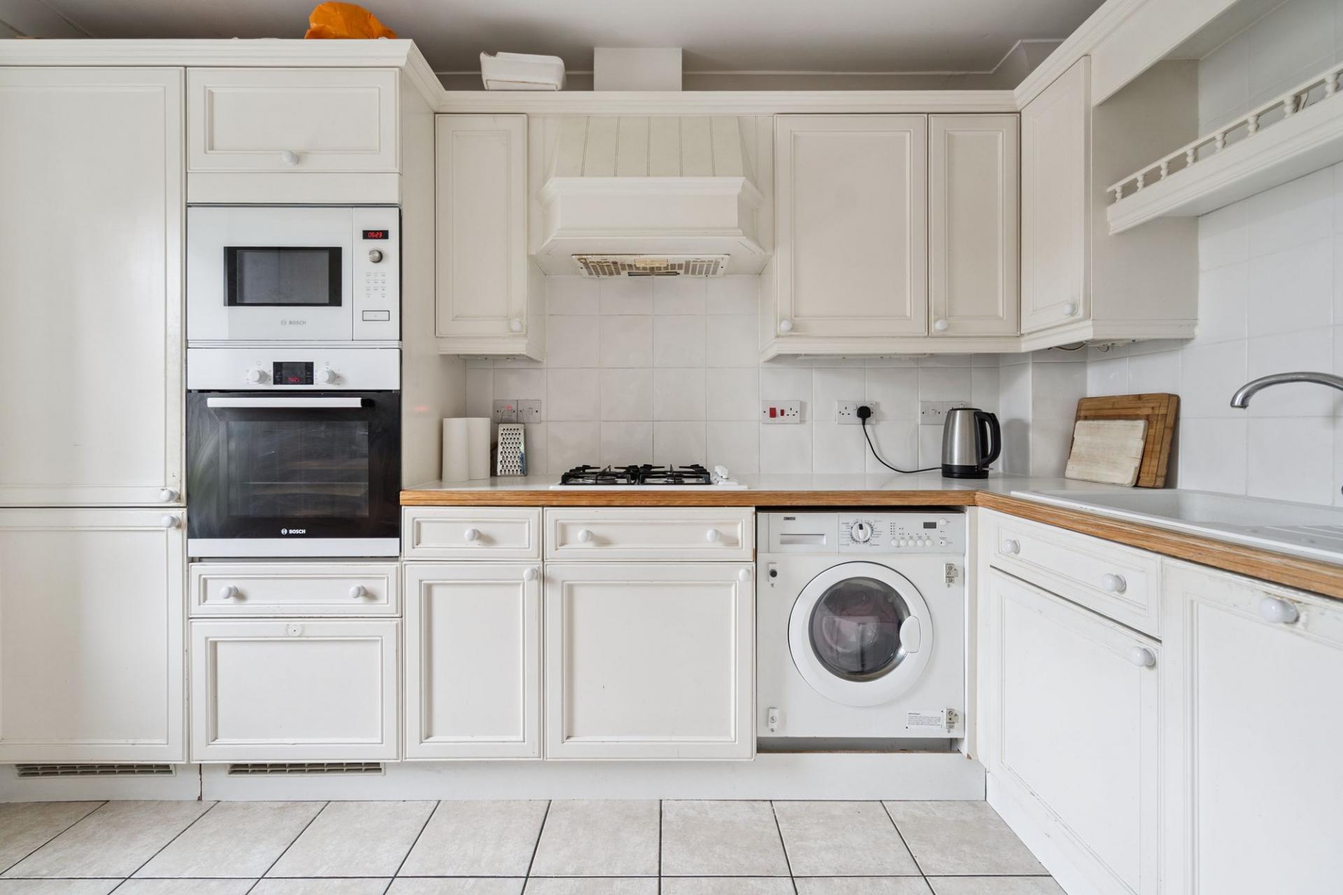 The kitchen is fitted with white cabinetry and integrated appliances including a oven, microwave, washing machine, and gas hob. Tiled flooring, ample storage, and generous work surfaces make this kitchen practical and ideal for those who love to cook..