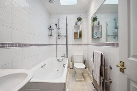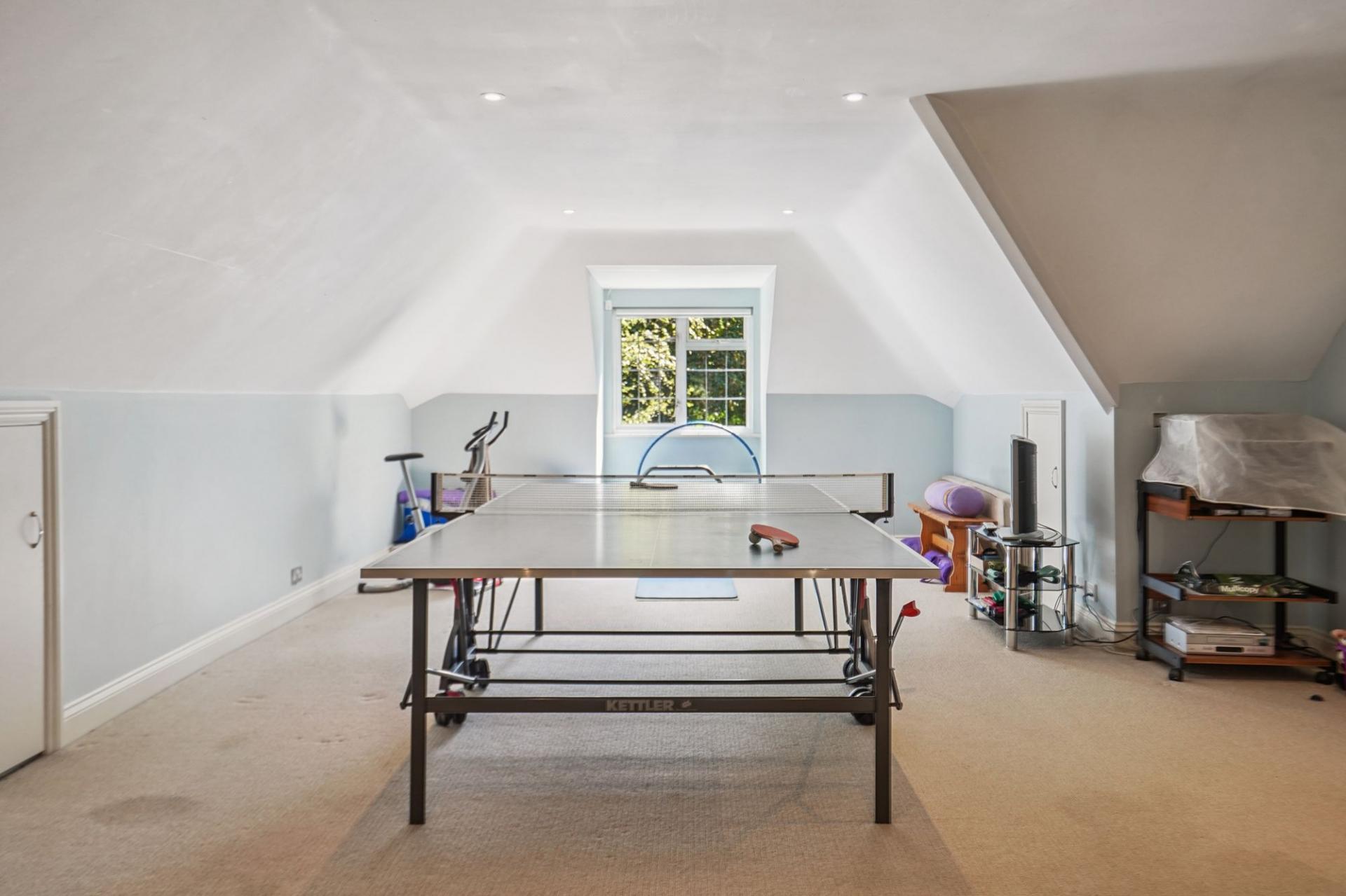There are three further bedrooms and a family bathroom with a sunken bath and separate shower to this side of the house, and a spacious guest room with en suite bathroom, and an impressively large double-aspect multi functional room to the other.