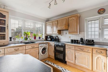 The kitchen offers a comprehensive range of base units with matching wall-mounted cabinets, along with space and plumbing for a washing machine and a free-standing cooker. A matching breakfast bar adds to the functionality of the space.