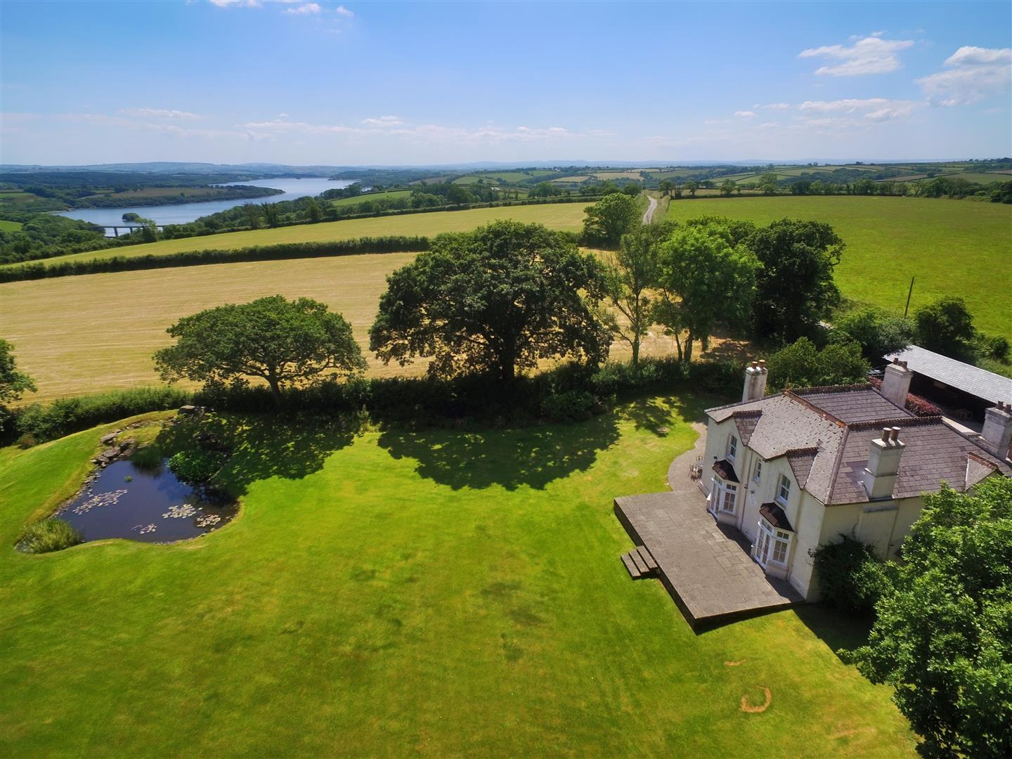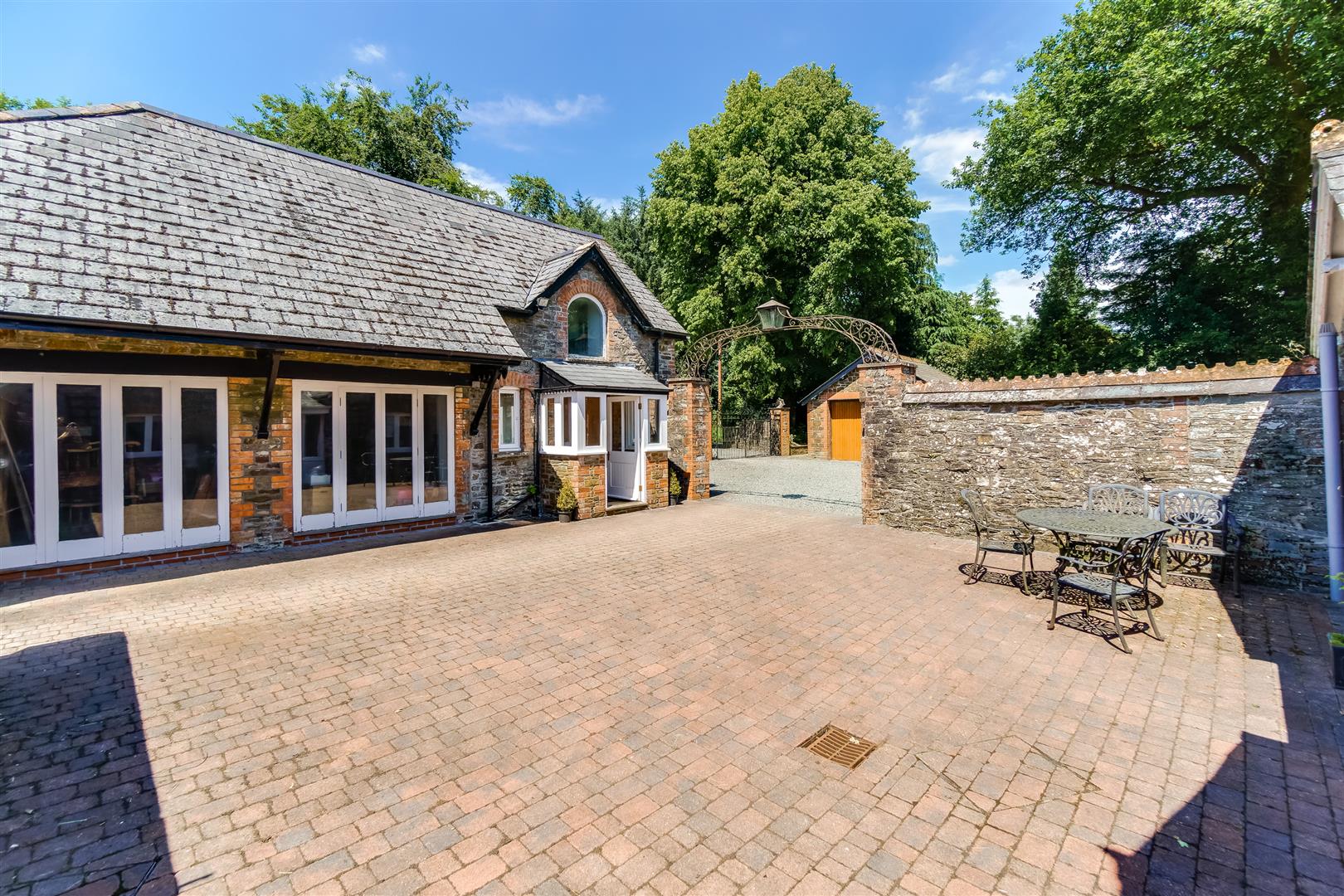From the quiet parish road a gated entrance opens onto a gravelled parking area and a decorative arched opening leads to a brick paved courtyard, the side of the house and the front of Courtyard Cottage. At the side of the gravelled parking area is a large, raised flower bed stocked with a variety of specimen shrubs and trees. A brick paved path leads to the front door flanked on either side by a large flower bed border and level lawn which continues around to the front and side of the house with a large paved patio which leads onto a brick paved patio to the side and front of the conservatory and are both ideal for alfresco dining and entertaining whilst enjoying the views over the lawned gardens, pond, land and the stunning panoramic views over the surrounding countryside to Dartmoor beyond.
