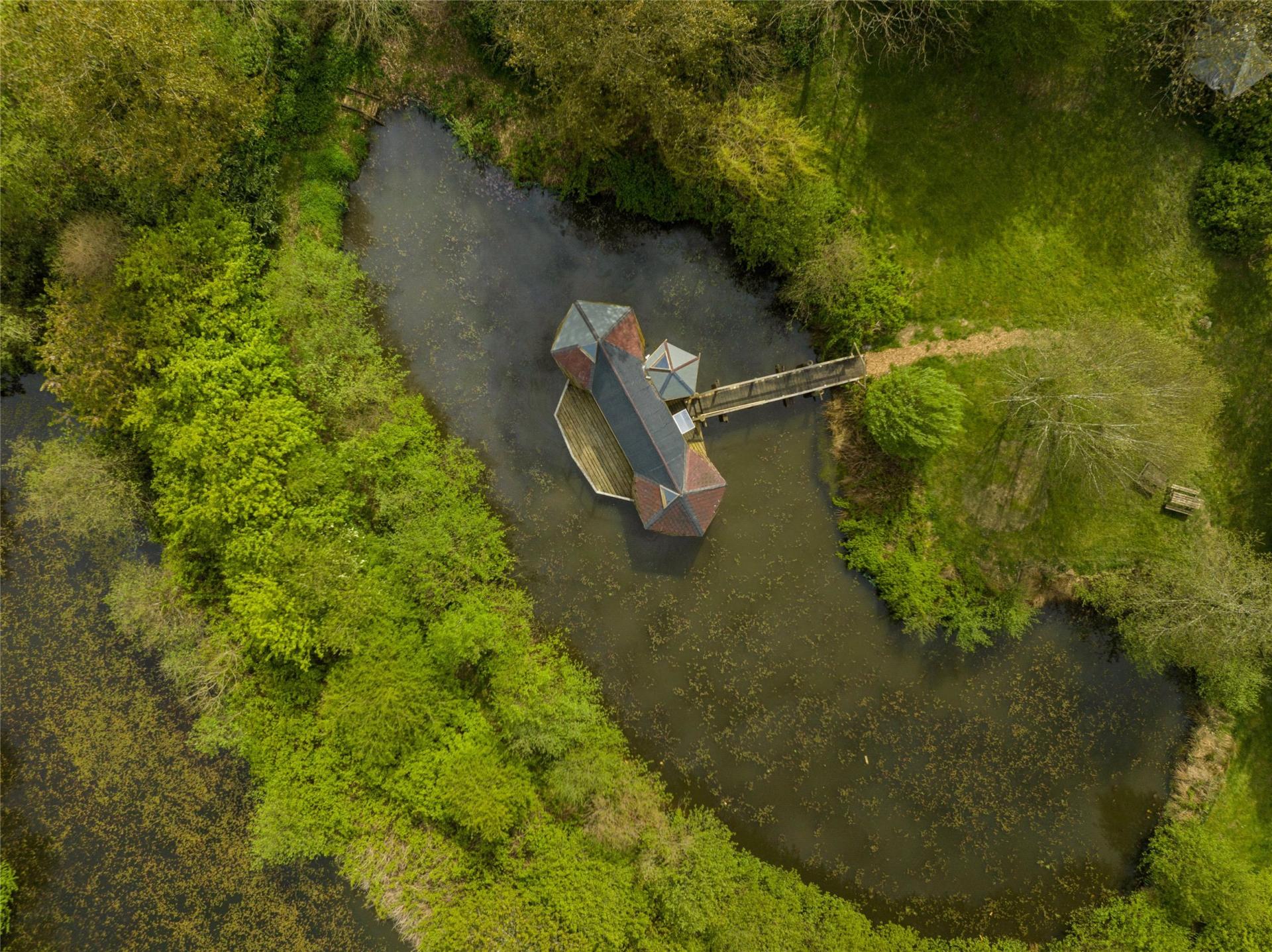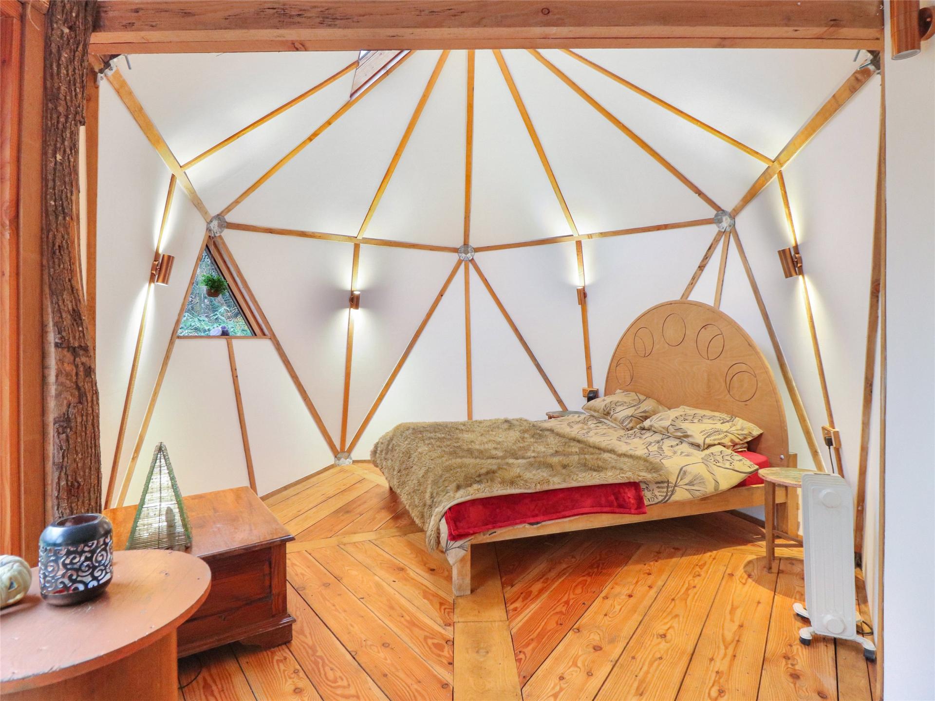 This is the most amazing geodome structure, with part copper tiled roof, that was subject to a TV programmes during its design and build. Approached across a wooden walk bridge Xanadu gives the appearance of hovering above the water and stepping inside this 40 space is quite an experience. Large bifold doors with decking outside overlook the water whilst the open plan space with hexagonal ends gives a feeling of light and airiness, having a sink midway, with bespoke copper pipe taps above protruding from a wavy birch panel. Leading off is a cloakroom WC.