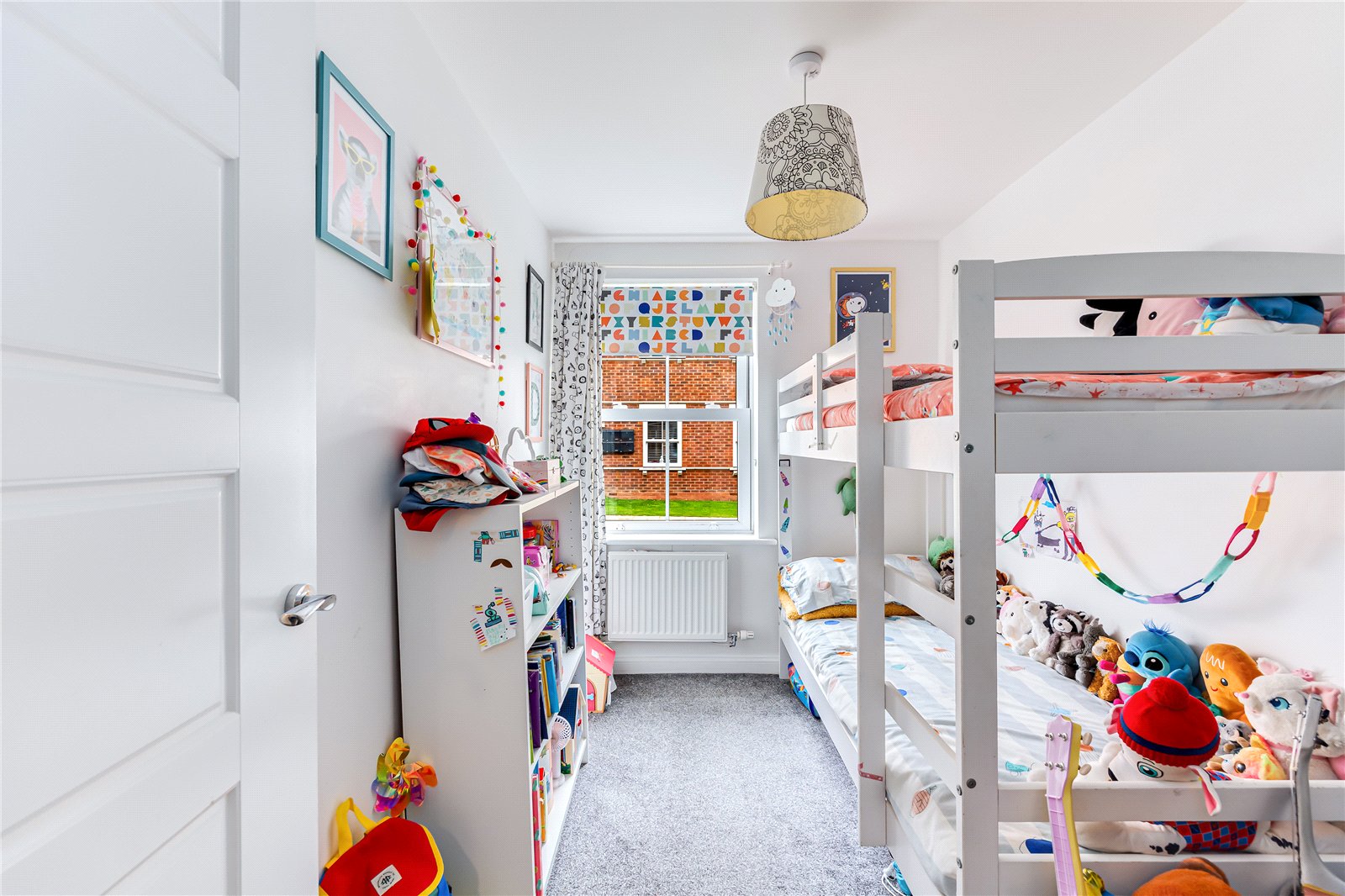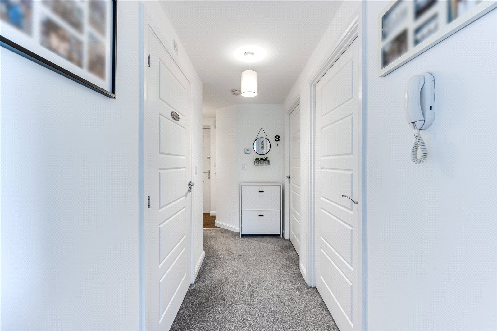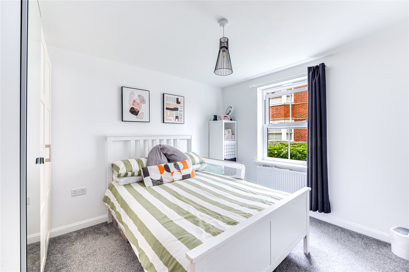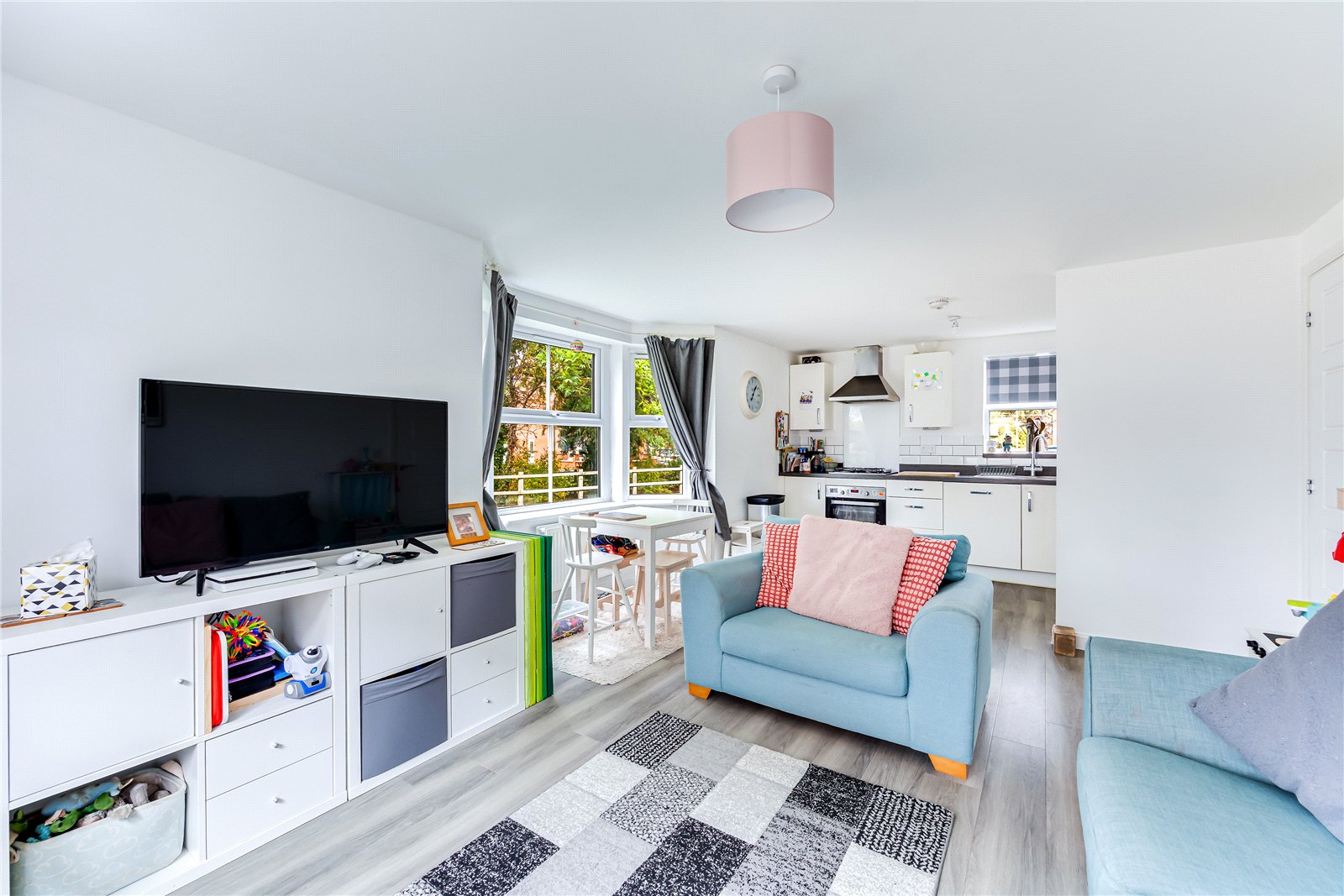 The property is accessed via a secure communal entrance. The hallway of the apartment is wide and welcoming, and boasts built in storage, including a utility cupboard housing a washer/dryer. There are two good size bedrooms overlooking communal gardens, and a modern family bathroom. The open plan living space benefits from two feature bay windows, with views out onto well maintained green spaces, and floods the area with natural light. There is ample space for relaxing and entertaining, and the modern fitted kitchen provides ample storage and worksurface space.