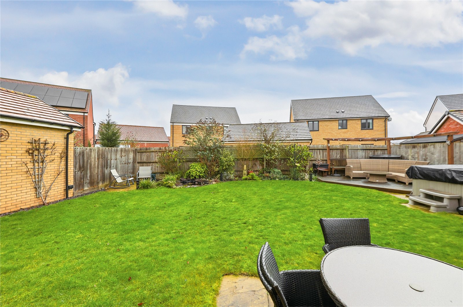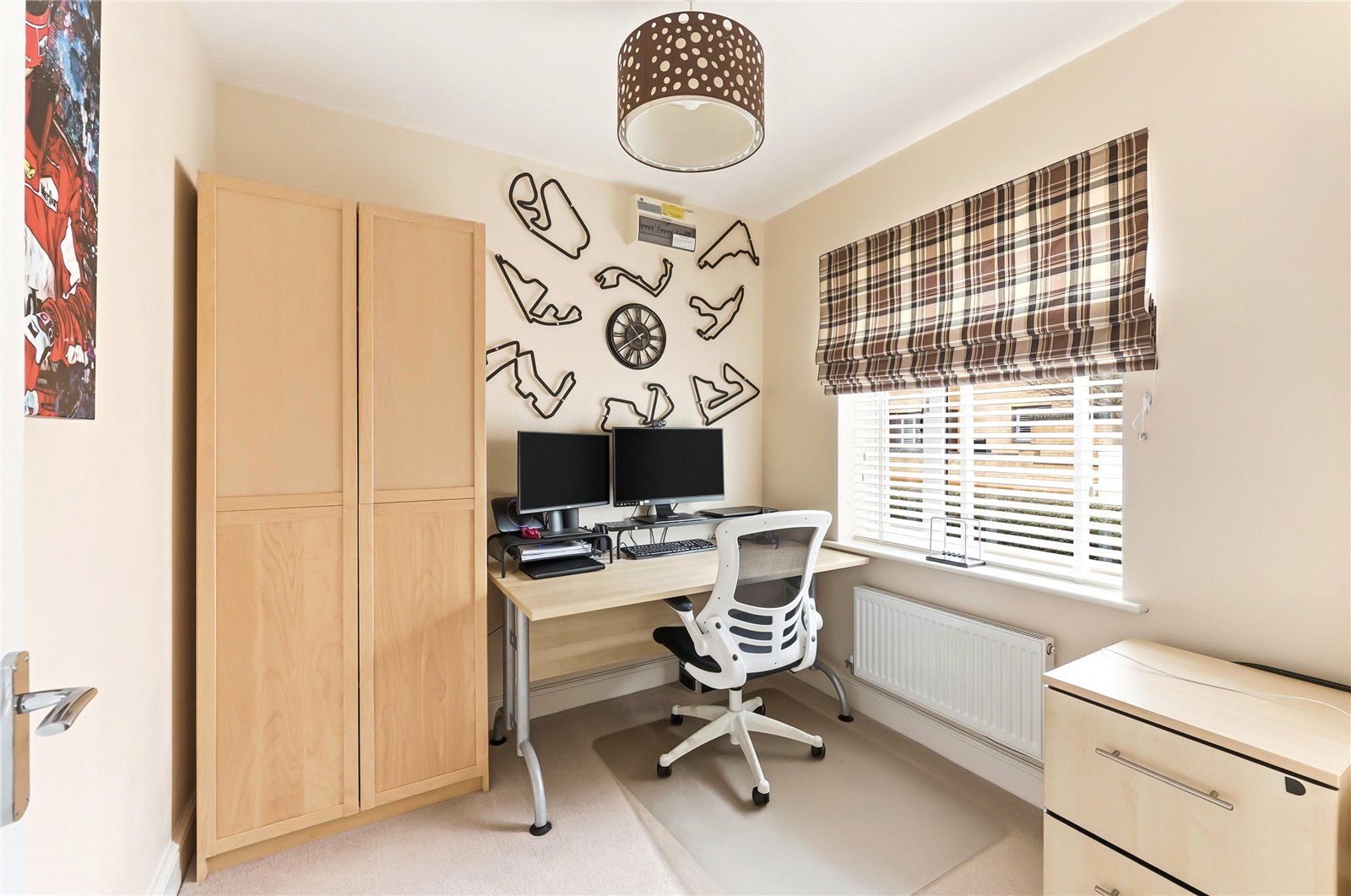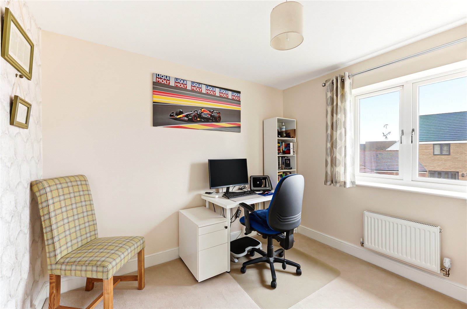 Entrance via a refitted front door into a wide and welcoming hallway, with access to the kitchen, WC, lounge and study. There is a convenient storage cupboard and stairs leading to the first floor. The kitchen/dining room runs the length of the property, and is fitted with a modern range of wall and base level units, with an additional kitchen island having been added by the current owners. There is ample entertaining space with room for family dining, and windows to the front and rear to allow plenty of natural light in. A door from the kitchen area leads to the handy utility room, which benefits from a door to the rear garden. The spacious lounge enjoys views over the rear garden with double doors providing direct access, and a feature fireplace ensures a cosy feel in the winter months. A useful and versatile study room sits at the front of the property, providing an ideal work from home space. The practical WC completes the ground floor accommodation. On the first floor, the landing provides access to all bedrooms, the family bathroom and a storage cupboard. The bedrooms are all generous doubles, and the master boasts fitted wardrobes and a contemporary en-suite shower room. The bright and airy family bathroom completes the internal accommodation. Outside, there is a neat front garden with path to the front door, and driveway parking at the side of the property leading to the garage. To the rear, the well maintained garden is mainly laid to lawn, with paved patio areas and mature plants and trees.
