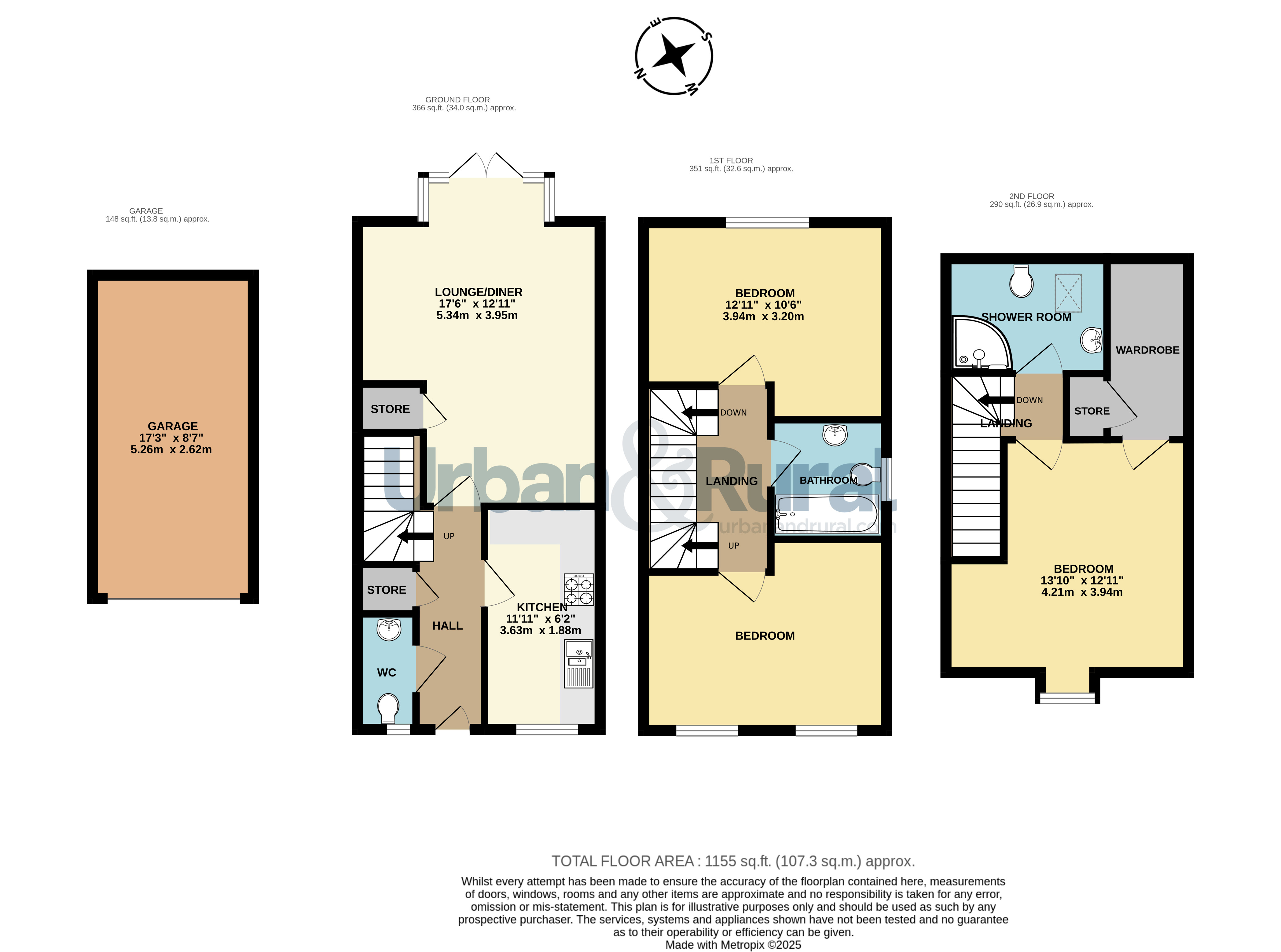 Access via a welcoming hallway providing access to the kitchen, convenient WC and lounge, with the additional benefit of built in storage. The refitted kitchen sits at the front of the house and boasts a range of wall and base level units in a modern colourway. The generous lounge/dining room spans the width of the property and enjoys views over the landscaped rear garden. On the first floor lie two good size bedrooms, one of which is currently being utilised as an additional lounge space. There is also a modern refitted family bathroom, with a three piece white suite and part tiled walls. On the top floor is the stunning master bedroom, with views to the front, and a purpose built walk in wardrobe which also provides access to the airing cupboard. The top floor is completed by a contemporary refitted shower room with large skylight window. Outside, there is a neat pathway to the front of the property, and driveway parking leading to the single garage, which features an electric roller door to the front, and also benefits from a power supply. At the rear is a well maintained landscaped garden, with a combination of paved patio areas, lawn and neat planted borders.