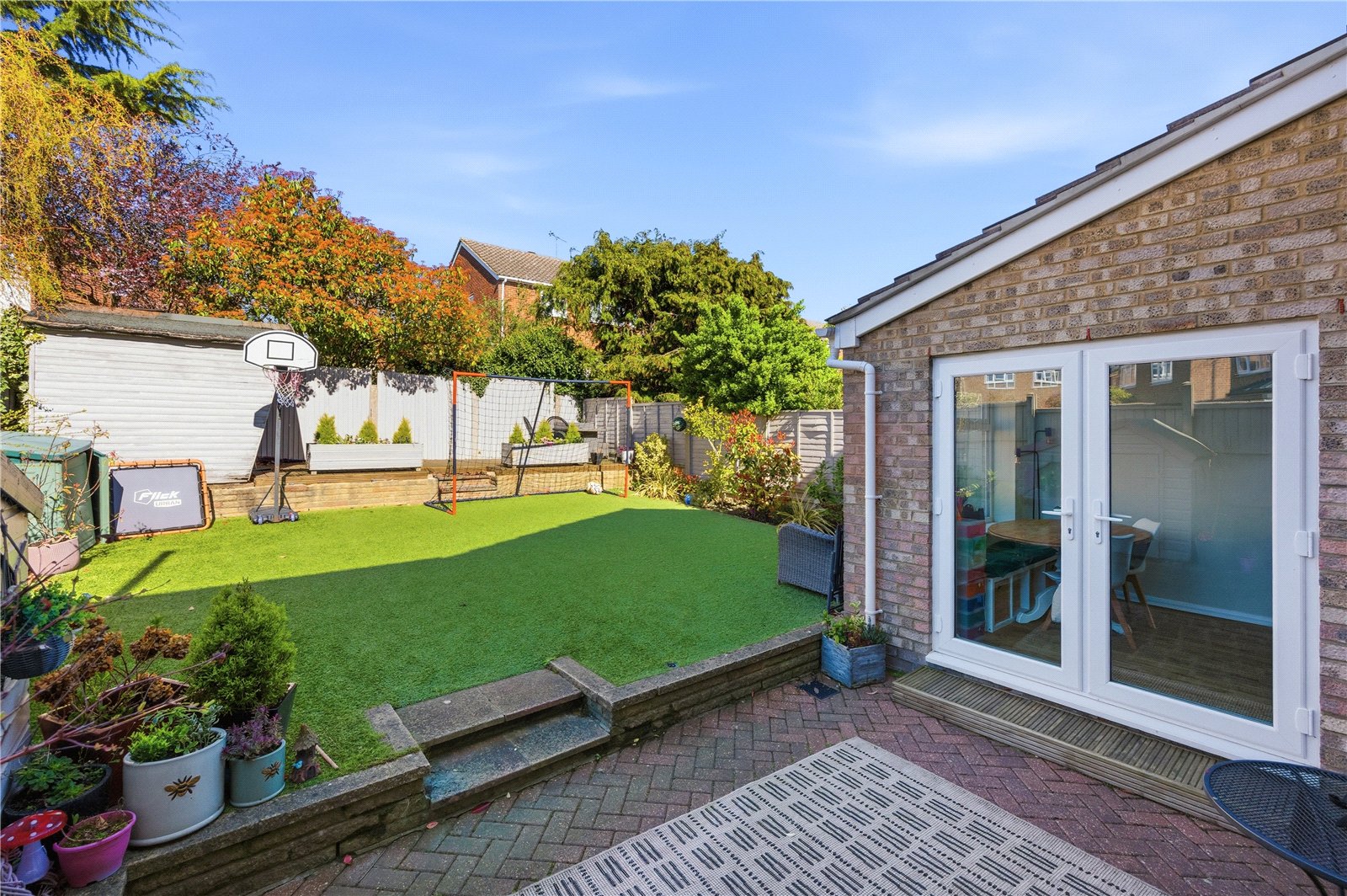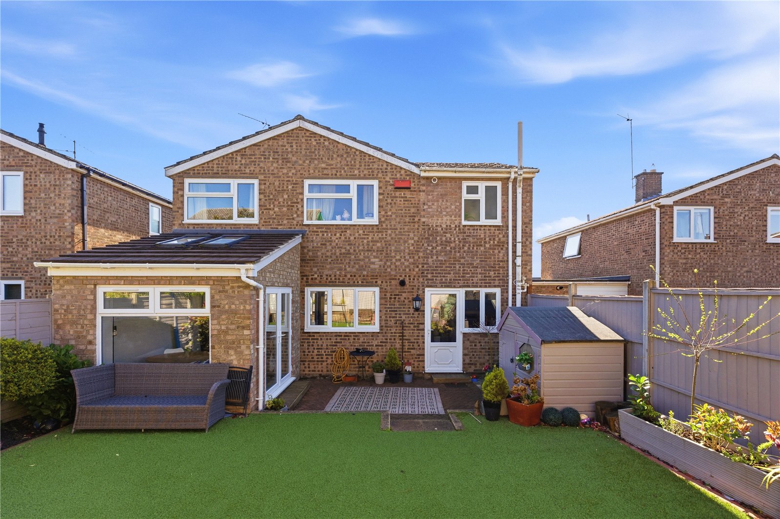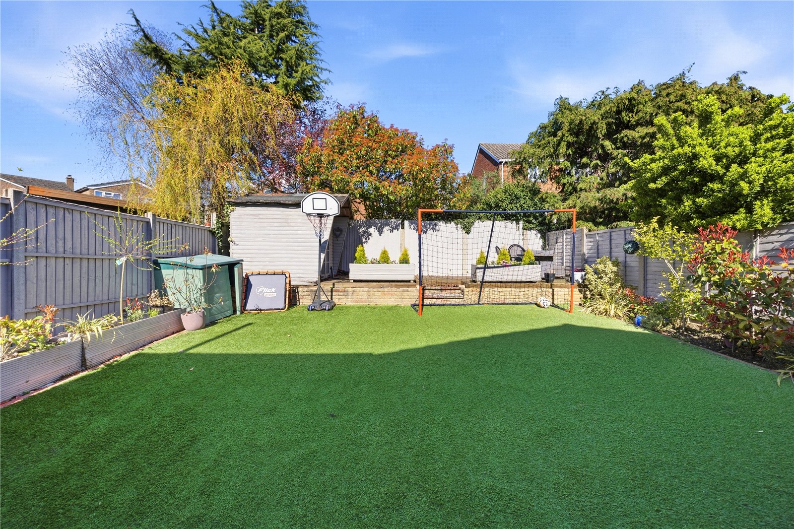 Externally, the rear garden has been thoughtfully landscaped to create a low maintenance yet highly usable outdoor space. A patio area sits immediately outside the property, ideal for entertaining, with the remainder laid to artificial lawn. A well stocked border runs along one side, filled with mature plants and shrubs, while steps lead to a slightly elevated seating area at the far end, alongside a useful storage shed. The garden is fully enclosed by timber fencing, offering a good degree of privacy.