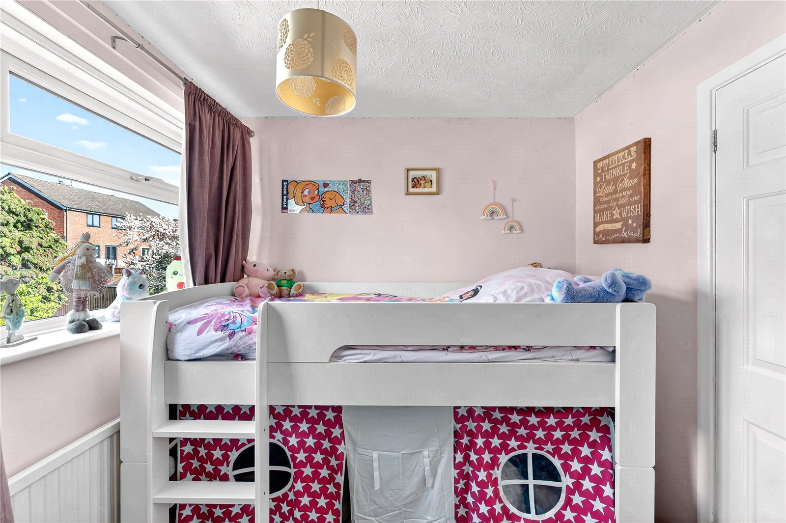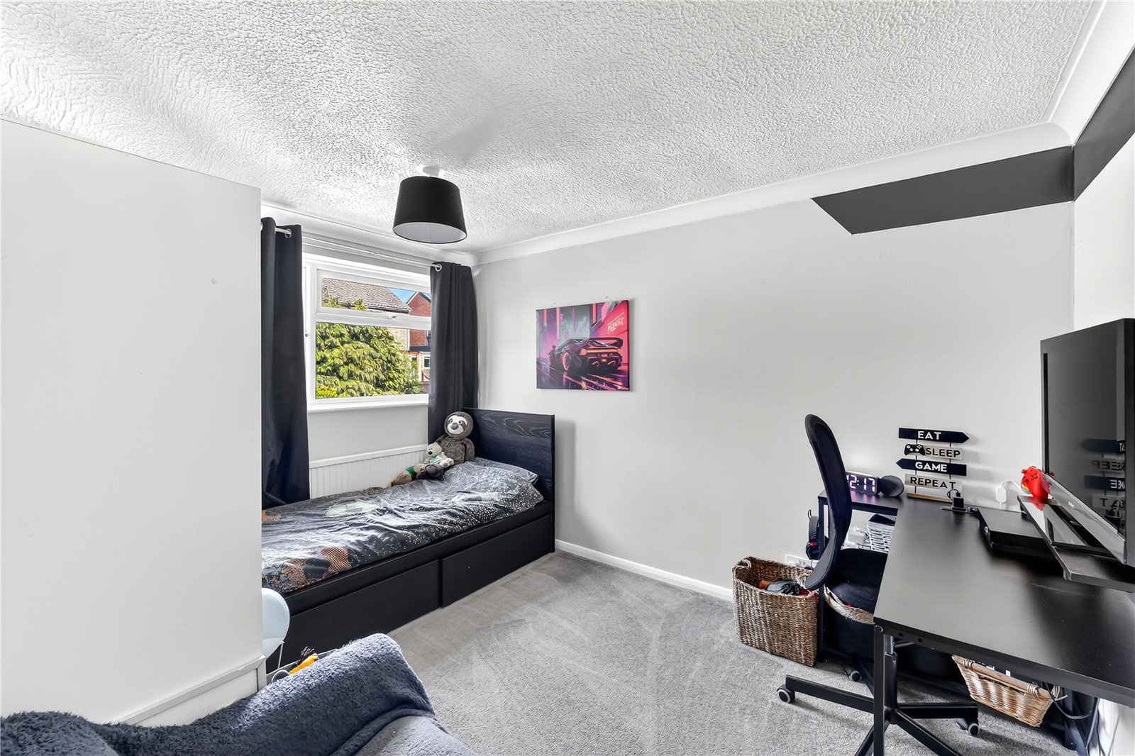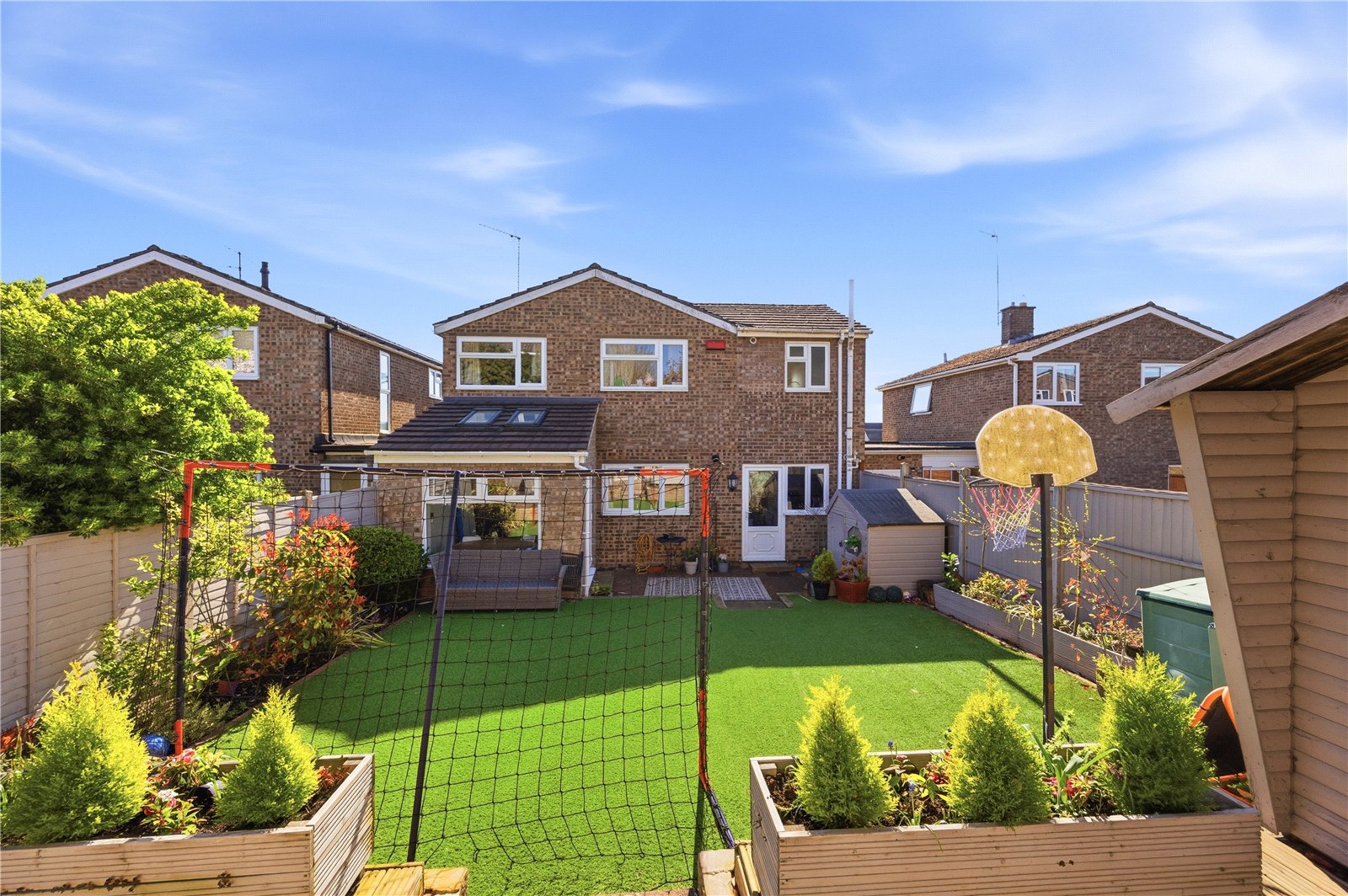 Externally, the rear garden has been thoughtfully landscaped to create a low maintenance yet highly usable outdoor space. A patio area sits immediately outside the property, ideal for entertaining, with the remainder laid to artificial lawn. A well stocked border runs along one side, filled with mature plants and shrubs, while steps lead to a slightly elevated seating area at the far end, alongside a useful storage shed. The garden is fully enclosed by timber fencing, offering a good degree of privacy.