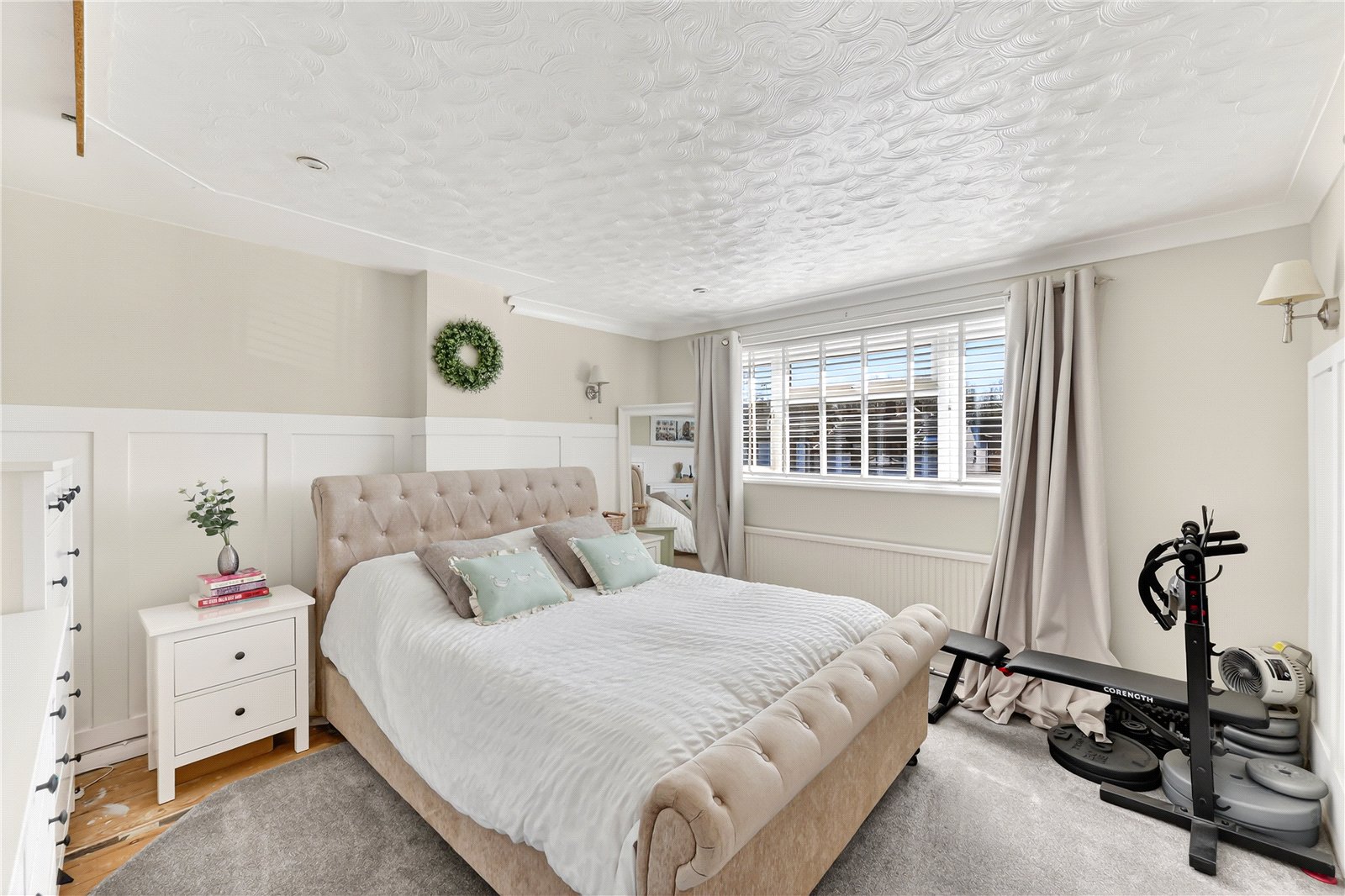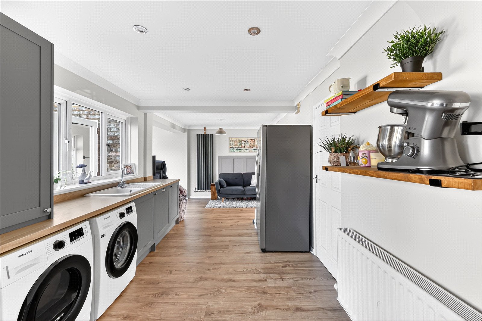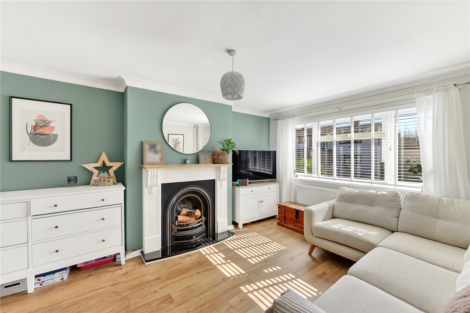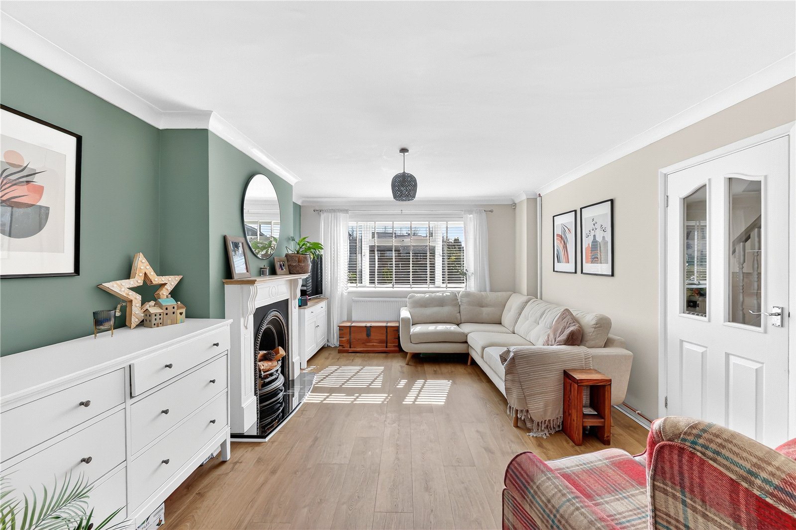 Positioned at the front of the home is the principal living room, measuring 15’5 by 12’2, offering generous proportions and flexible furniture placement. A cast iron fireplace provides a charming focal point, while the room has been finished in stylish, contemporary tones.