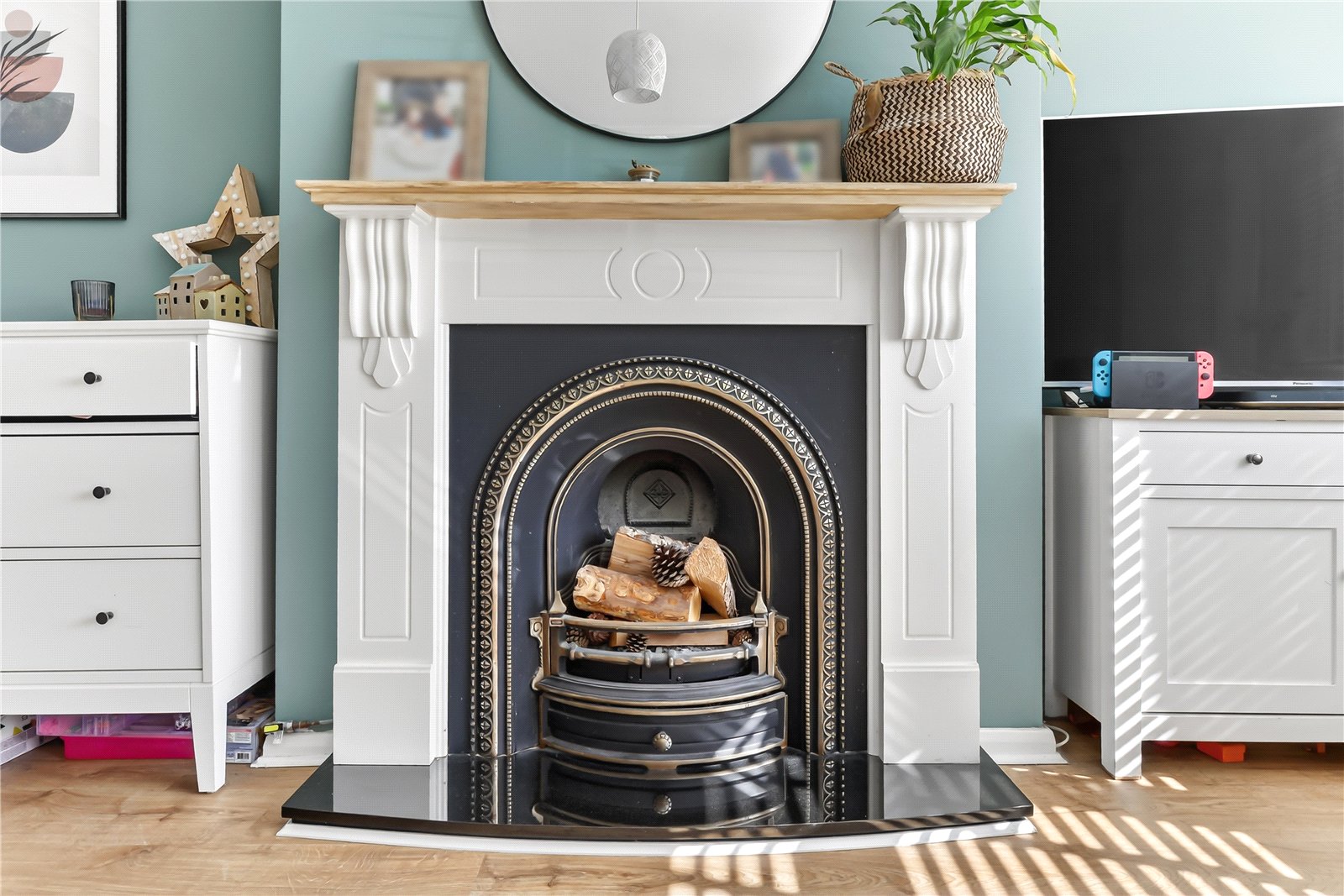 • Immaculately decorated living room with cast iron fireplace