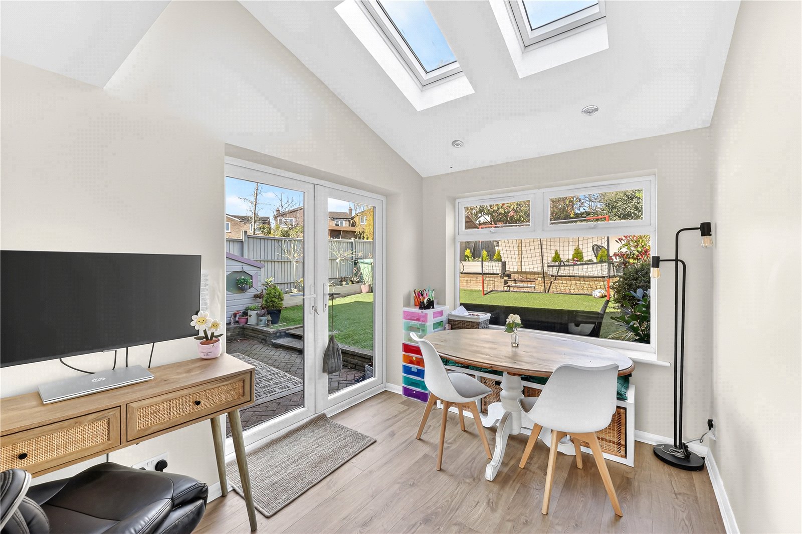 To the rear, a further reception area currently utilised as a sitting/dining room enjoys delightful garden views and is enhanced by a striking vaulted ceiling with Velux windows, flooding the space with natural light and adding a real sense of volume and character.