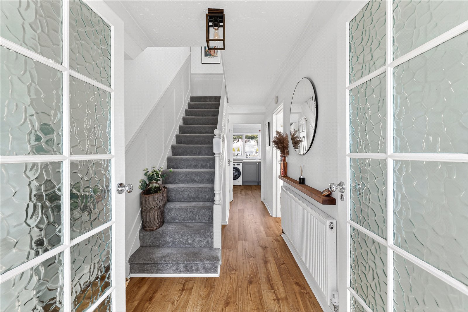 The property is approached via a block paved driveway, complemented by a shingled frontage, and leads to a single garage with an up and over door. Internally, the home opens into a useful porch which in turn flows seamlessly into the entrance hall. Here, a staircase with elegant panelling rises to the first floor, while a convenient cloakroom is also located off the hallway.
