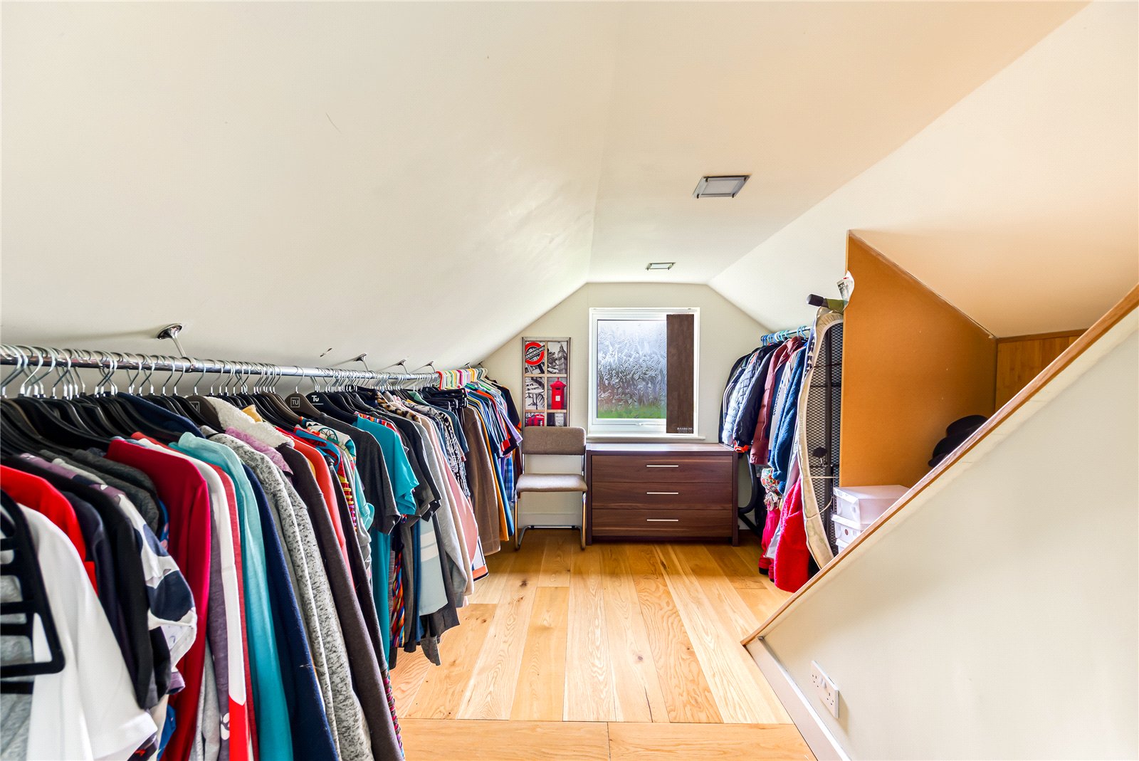 To the first floor, the landing serves two well proportioned bedrooms. The master of which benefits from a dual aspect orientation and the convenience of an en-suite, fitted with a walk in shower cubicle, concealed cistern WC and wall mounted wash basin, finished with a blend of stylish tiling and wooden panelling to the splashback areas. Across the landing, the final bedroom features a charming shaped ceiling and is currently used as a dressing room for the main suite.