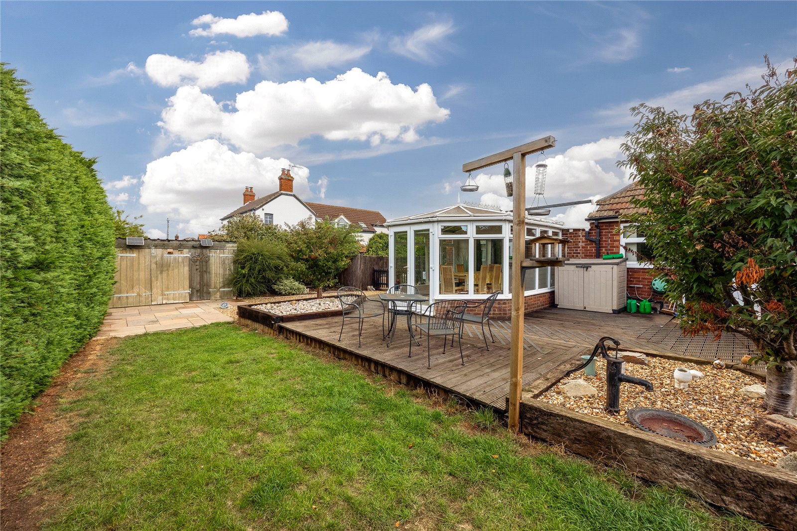 Externally, the rear garden wraps around the property and has been thoughtfully landscaped to create a variety of spaces. A decked seating area immediately outside provides the perfect spot for relaxing or entertaining, while beyond, the garden is mainly laid to lawn with additional features including a paved terrace, shingled borders and raised sleeper beds with mature planting.