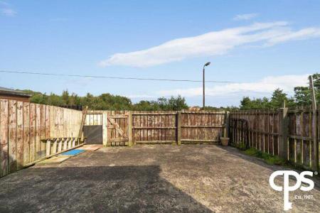 Paved rear with wooden panel fence and pedestrian gate.