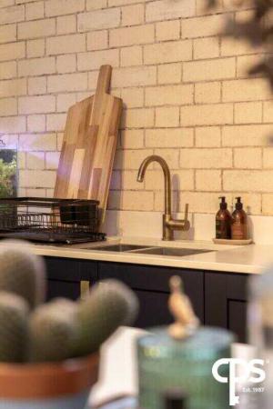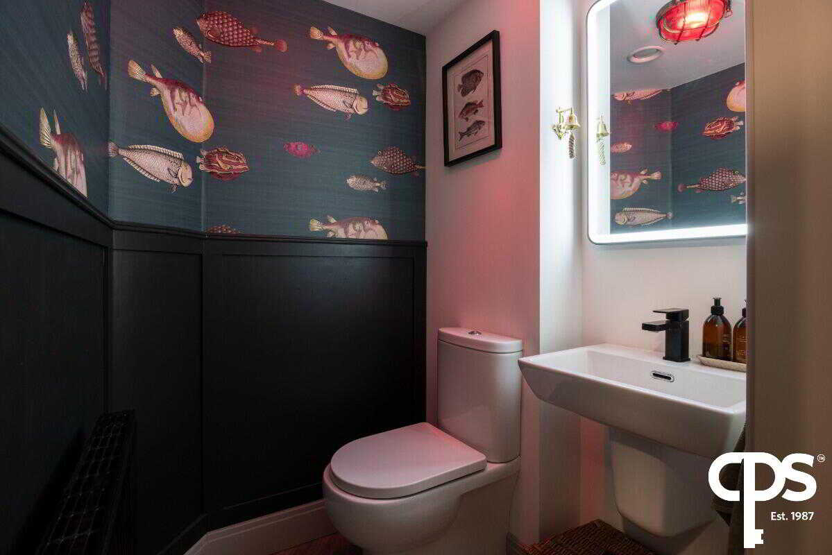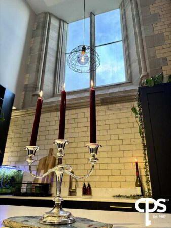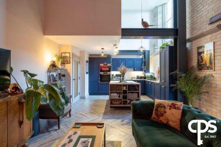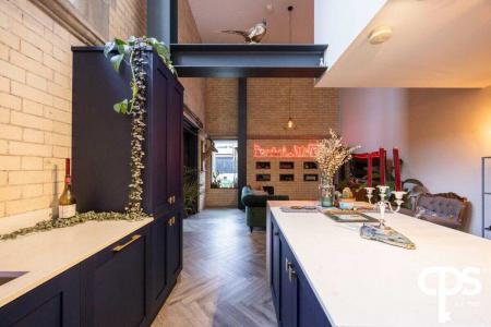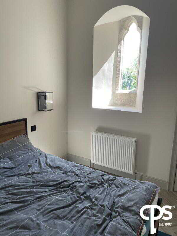 This open plan living/kitchen area offers ample space with high ceilings and a beautiful large church window enabling a plethora of natural light. This area is an exemplary mixture of original and contemporary features with exposed brick walls and recessed ambry boxes. The kitchen itself is fully fitted with navy high and low units and a large central island. The kitchen has a range of Bosch integrated appliances including dishwasher, induction hob, oven and microwave.