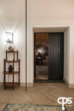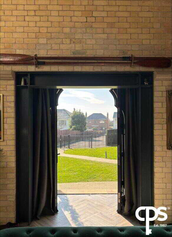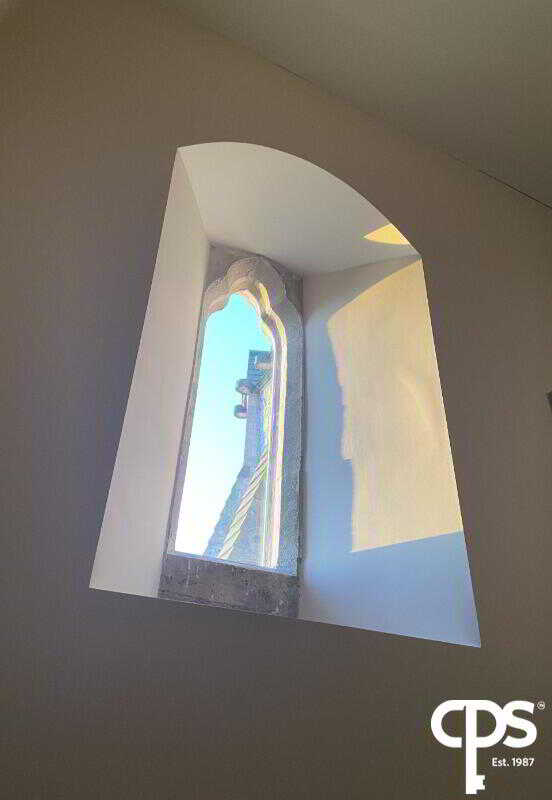 Via the large traditional church doors into the open plan living and kitchen area, which has sole door access to the Bell Tower.