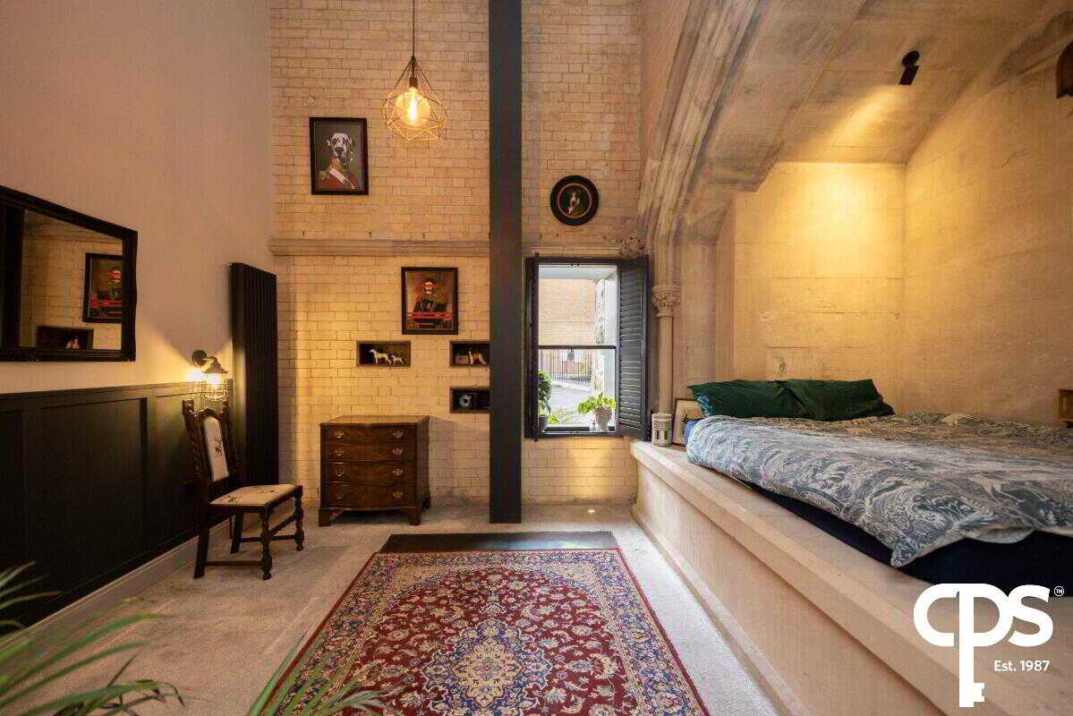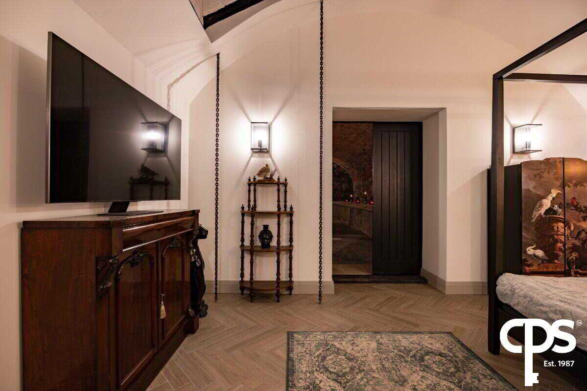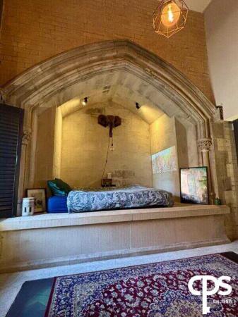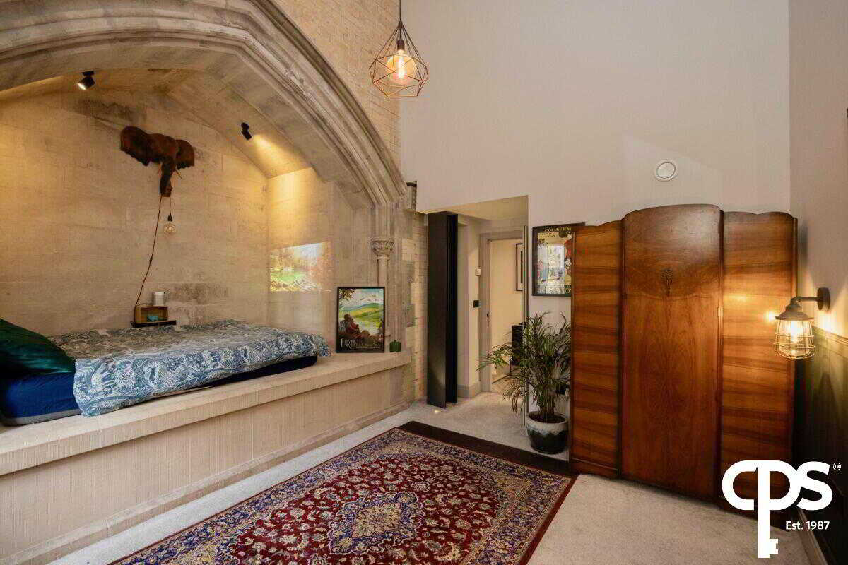 This generously sized double bedroom is situated downstairs, surrounded by rich historical features and offering direct access to the Crypt. It boasts a striking arched ceiling and stylish herringbone tiled floor. With its unique character and spacious layout, this room also holds excellent potential for dual use as a games room or entertaining space