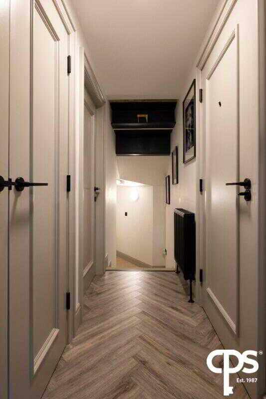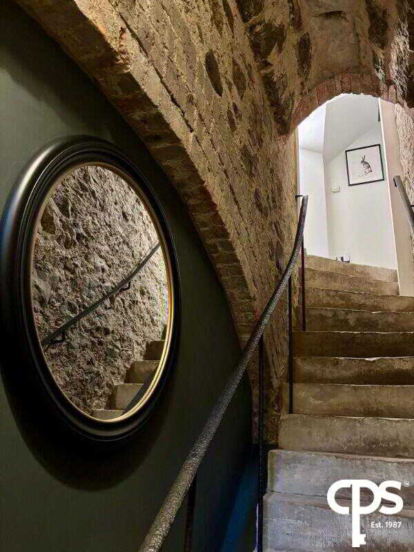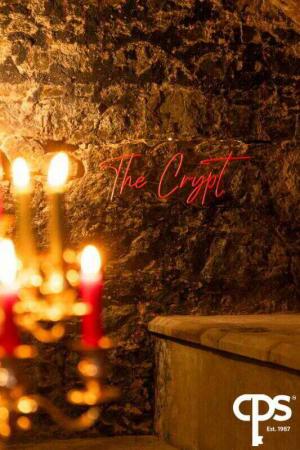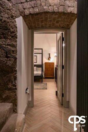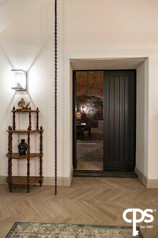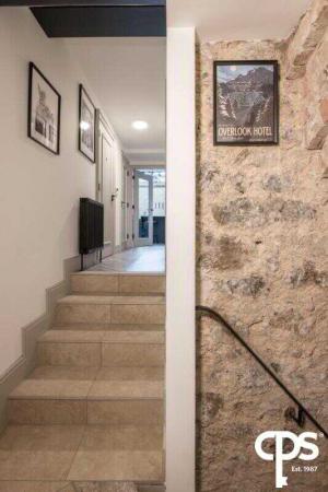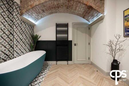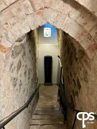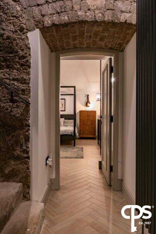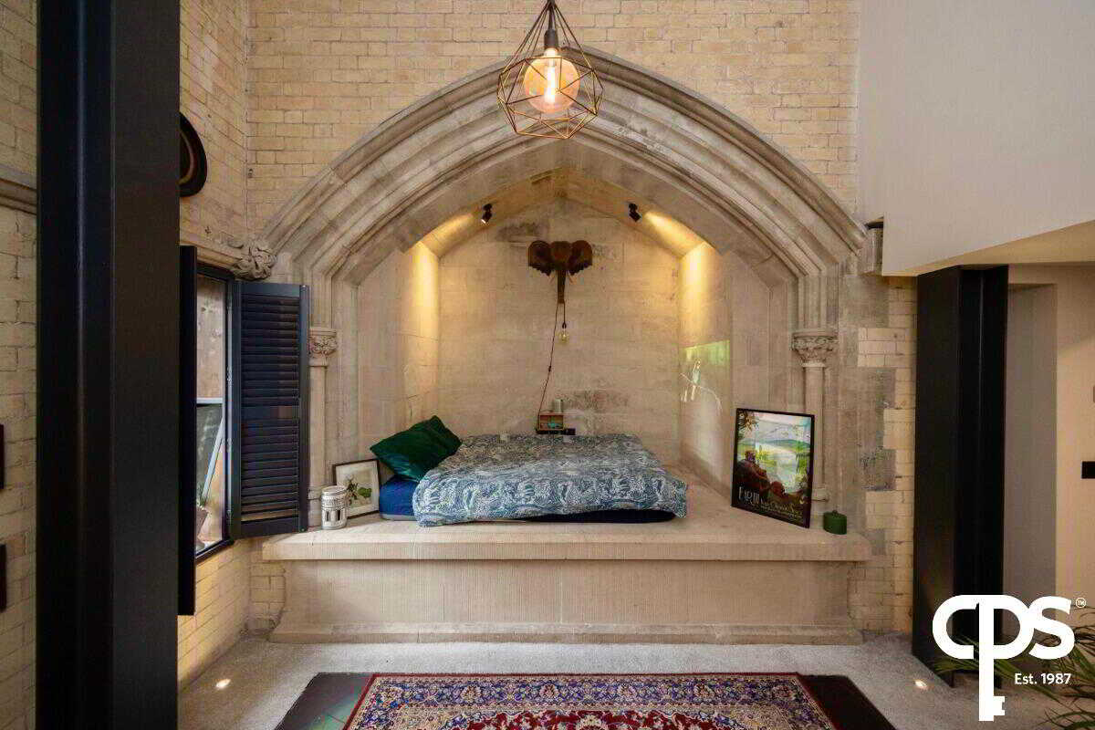 This generously sized double bedroom is situated downstairs, surrounded by rich historical features and offering direct access to the Crypt. It boasts a striking arched ceiling and stylish herringbone tiled floor. With its unique character and spacious layout, this room also holds excellent potential for dual use as a games room or entertaining space