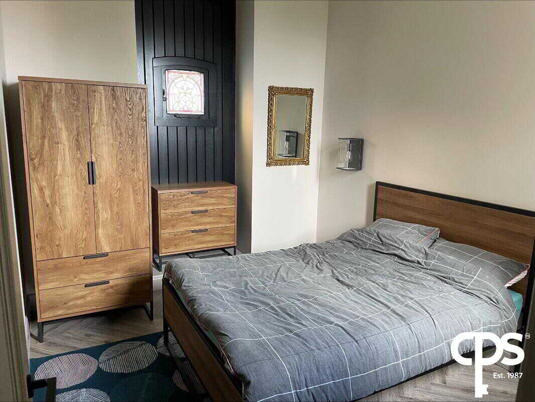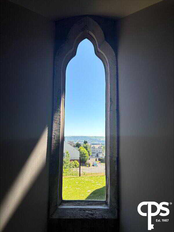 A warm and inviting double bedroom, complete with a charming fixed door and stained glass window. Through the ornate church window, the views extend to Belfast City and it’s coastline.