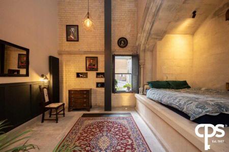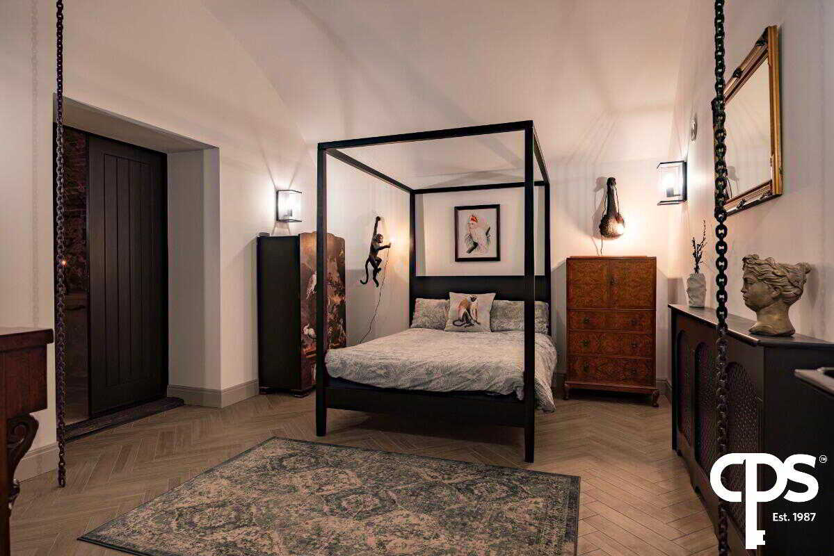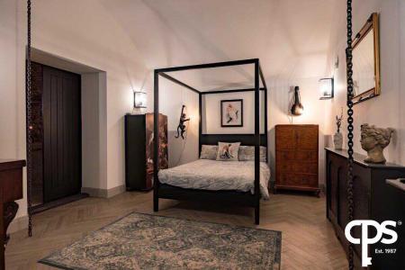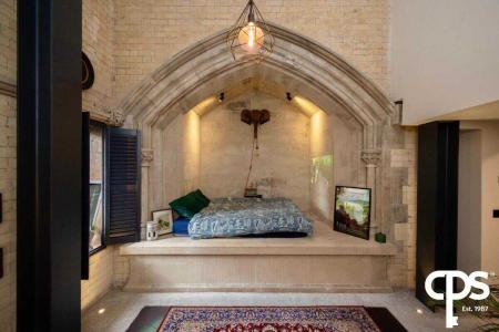 This large bedroom features high ceilings, wood panelling and an exposed brick feature wall. This room incorporates a bespoke sandstone alcove, with decorative stone carvings and a king sized bed with a one of a kind feature glass floor.