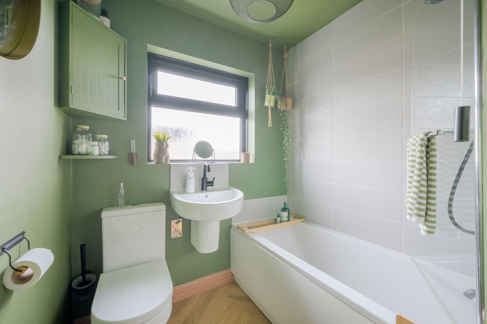 Family Bathroom: - Modern white suite comprising low flush WC with push button, floating wash hand basin with matt black mixer tap, panelled bath with matt black mixer taps, thermostatically controlled valve, telephone hand unit, part tiled walls, laminate wooden floor, frosted glass window, chrome heated towel rail.
