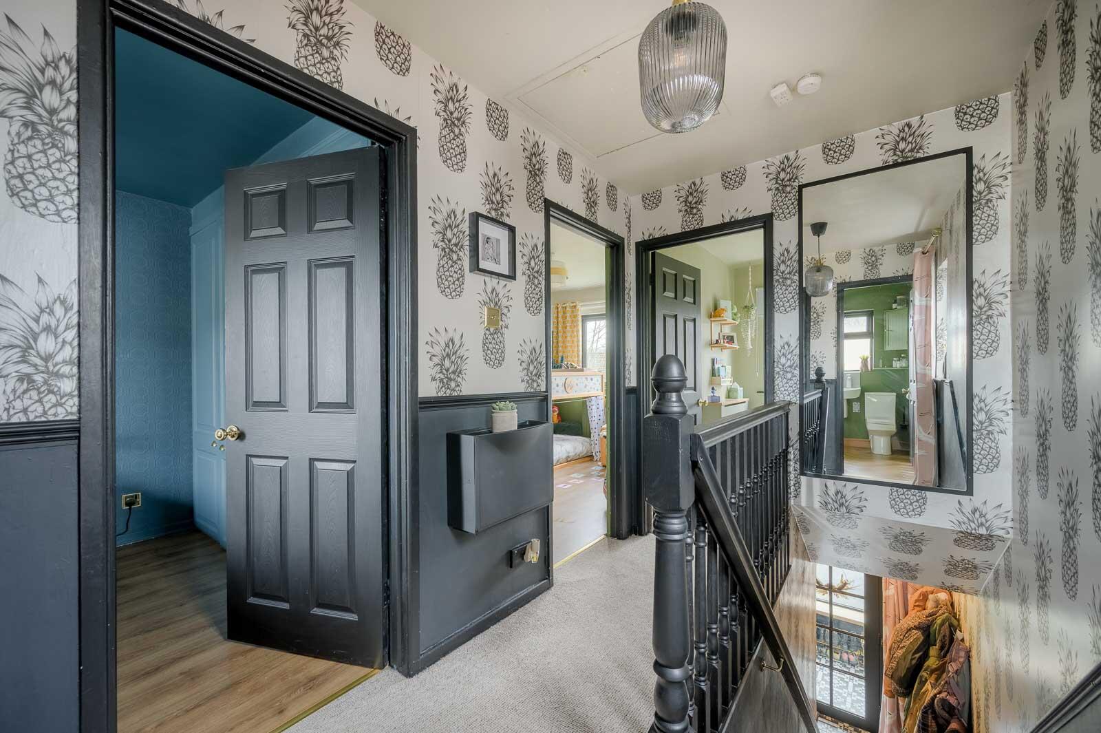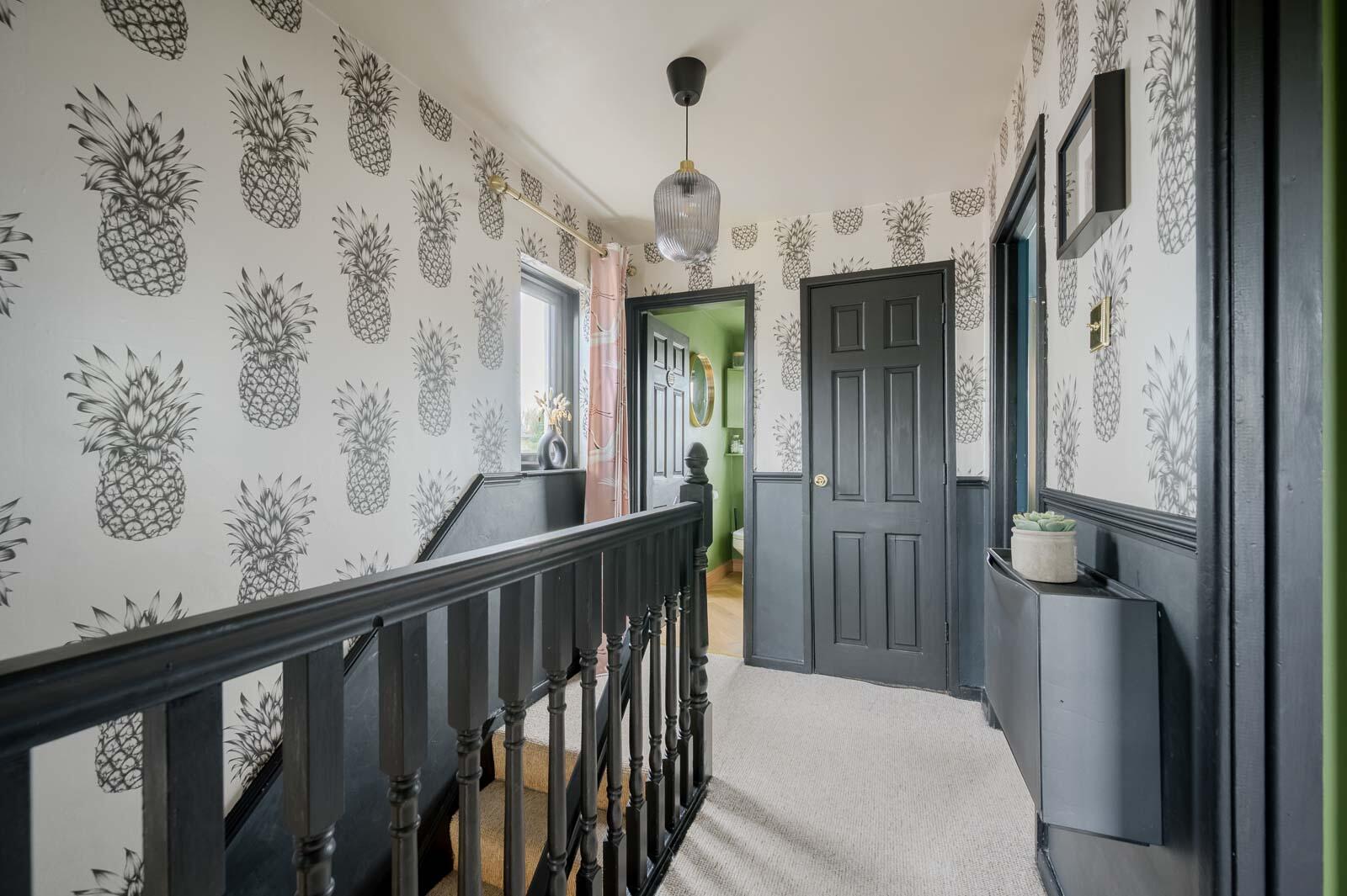 Stairs To First Floor Landing: - Built-in storage cupboard with additional shelving, access hatch to roof space.