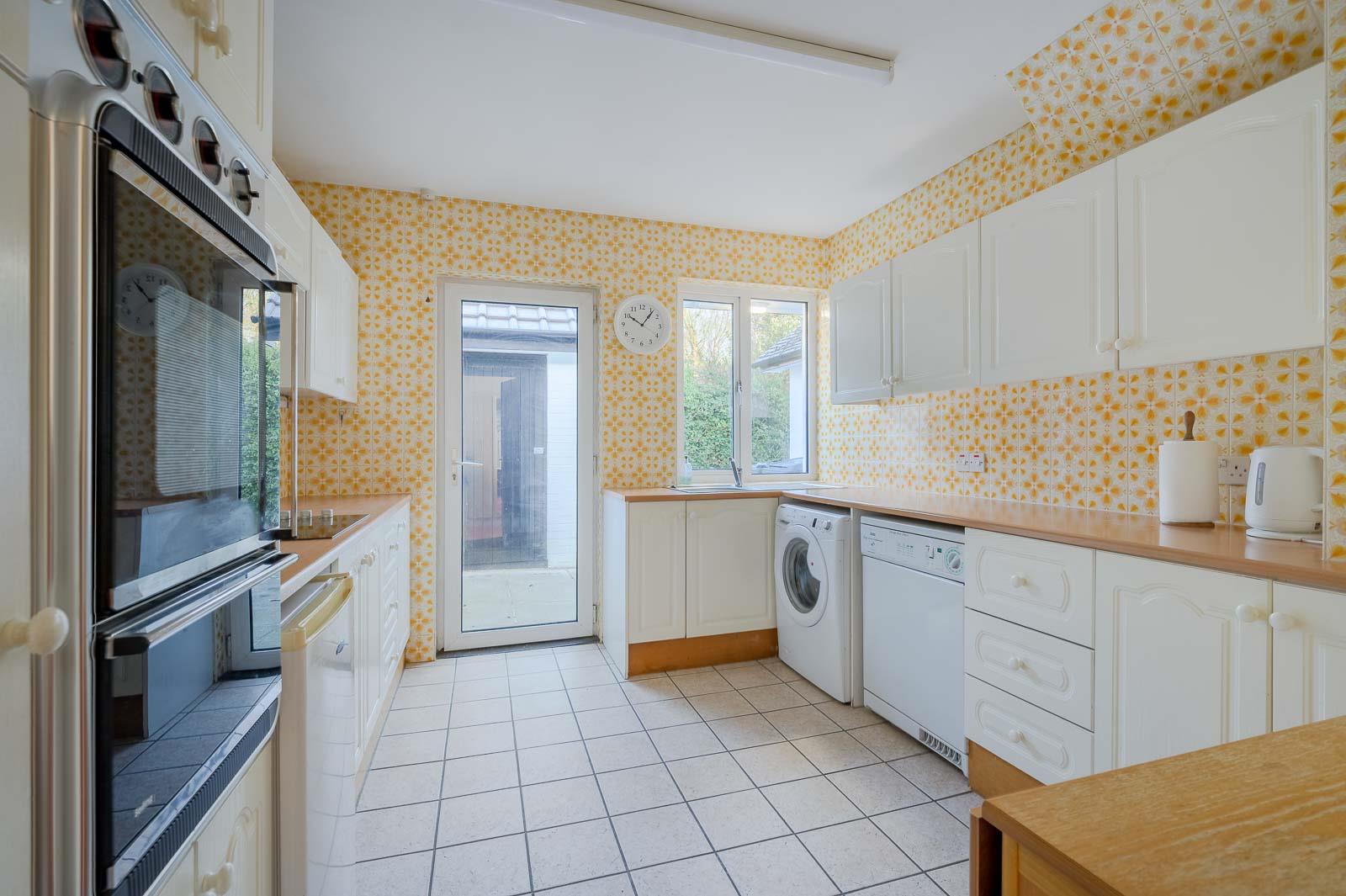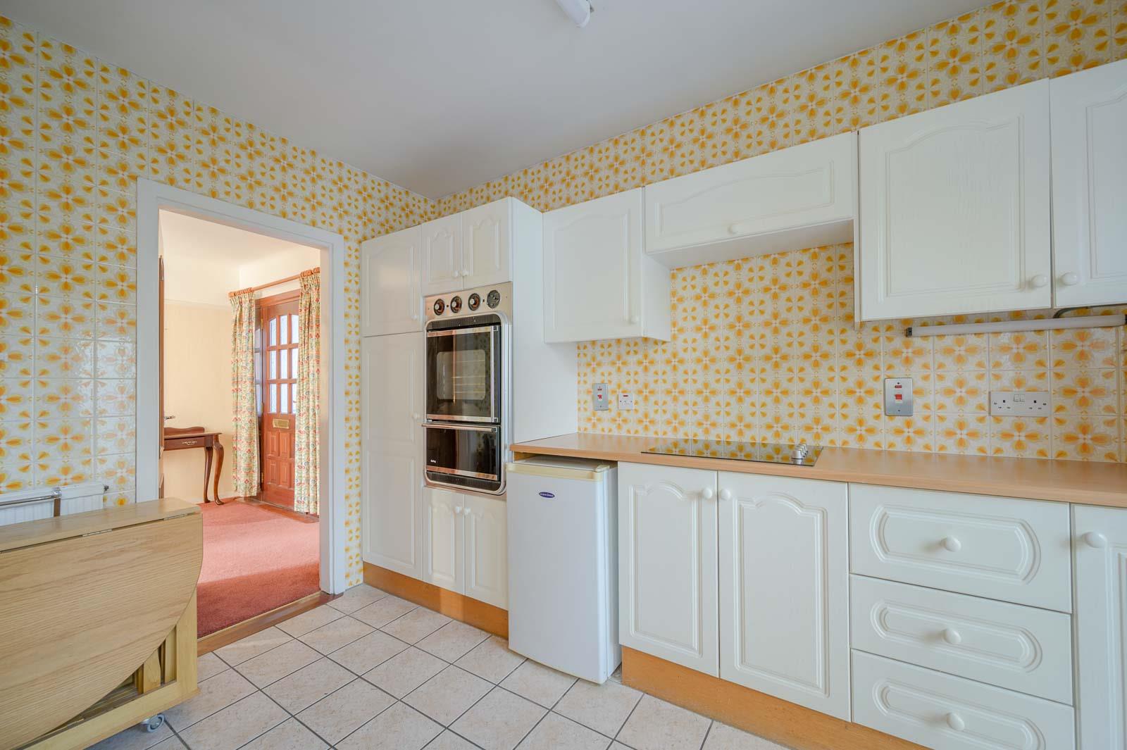 Kitchen: - 3.35m'2.13m" x 3.05m'0.61m" (11'7" x 10'2" ) - Fitted kitchen with range of high- and low-level units, laminate worktop, stainless steel sink unit, integrated double oven, ceramic hob, and extractor fan, under counter fridge space, plumbed for washing machine and dishwasher, tiled floor, tiled walls, PVC double glazed side door to side courtyard.