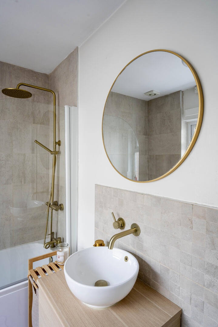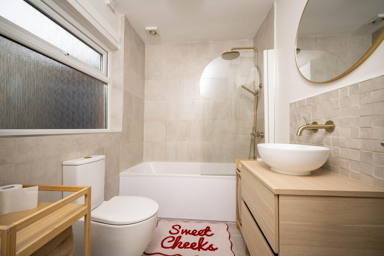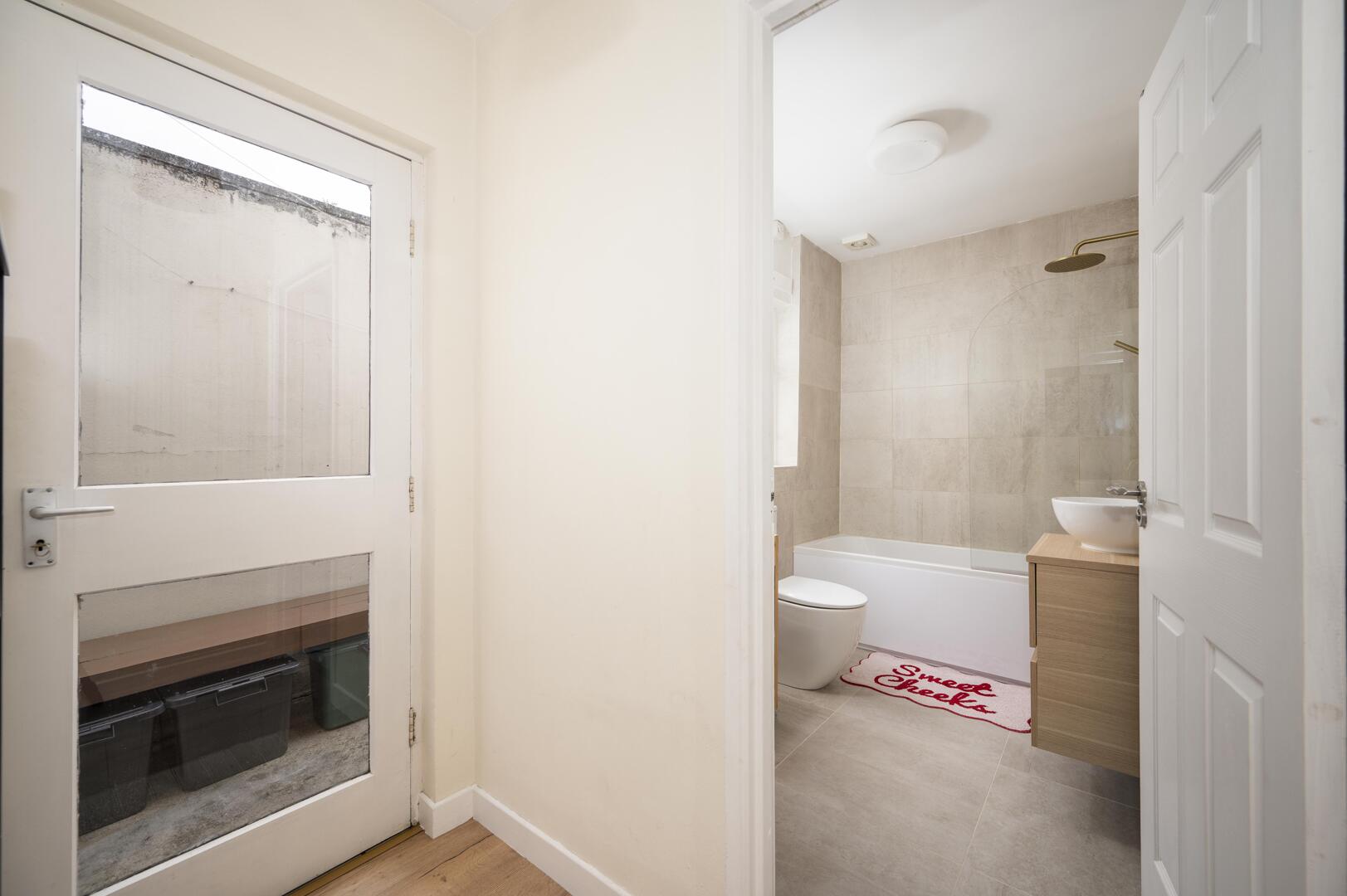 Downstairs Family Bathroom: - Modern white suite comprising low flush WC with push button, countertop wash hand basin with vanity unit below, brushed brass mixer tap, panelled bath with brushed brass mixer tap, thermostatically controlled valve, telephone hand unit and overhead shower, part tiled walls, ceramic tiled floor, modern vertical radiator, frosted glass window, extractor fan.