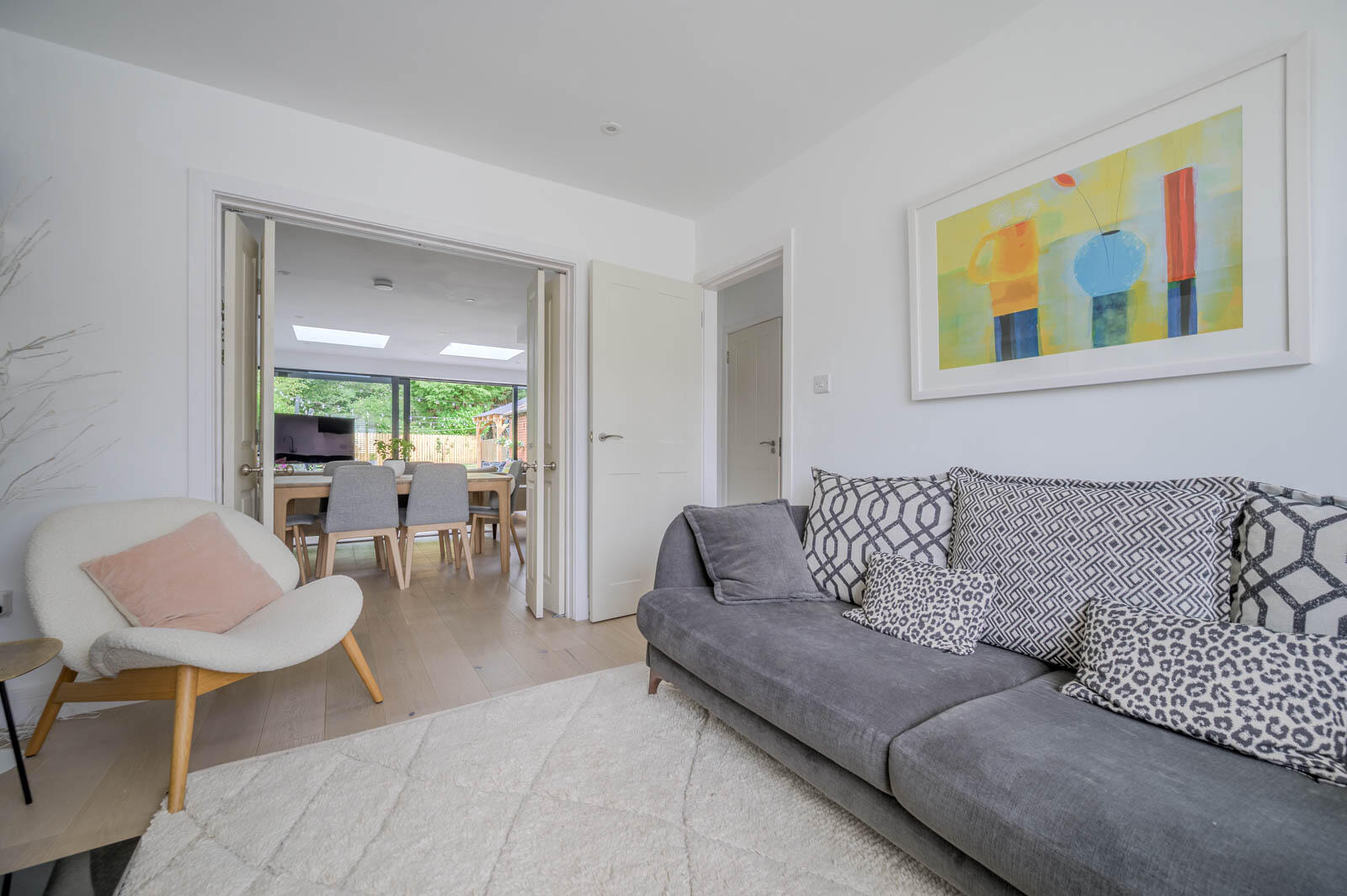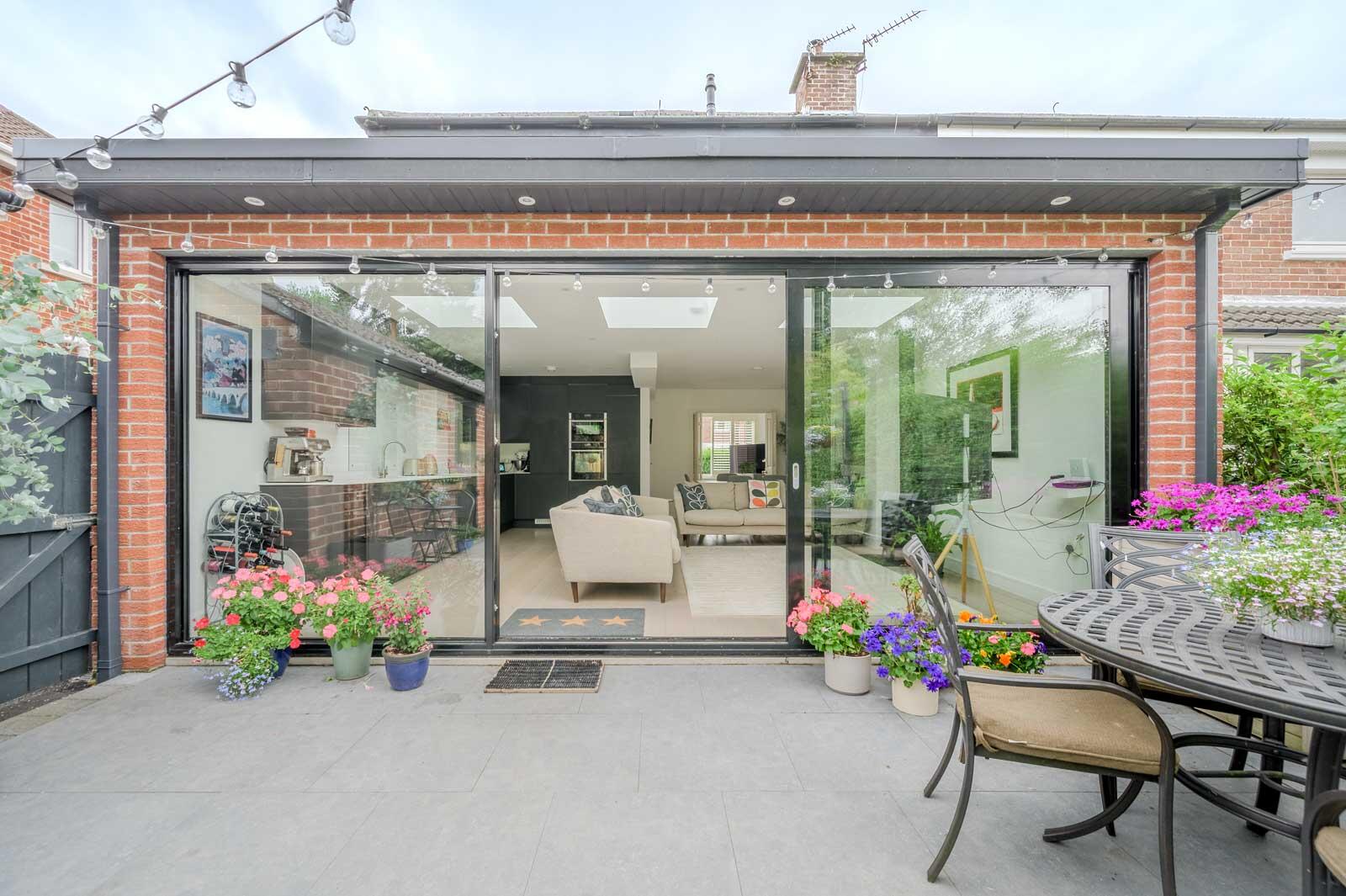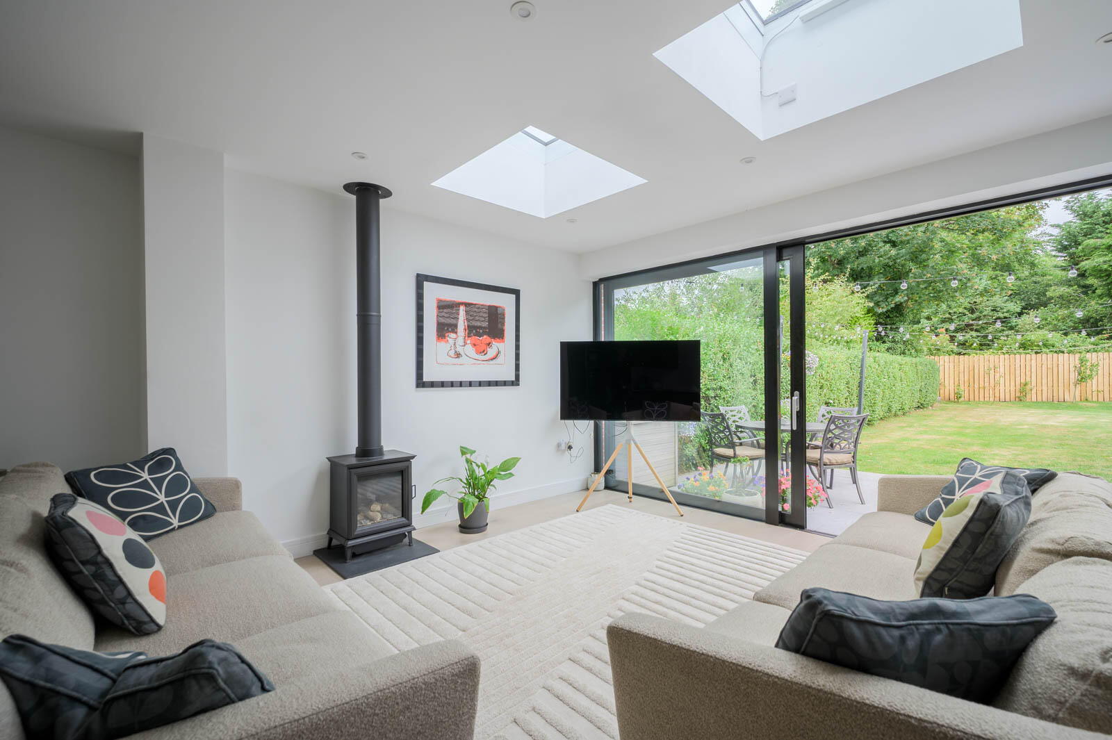 .Front Living Room with Open Fire and Bi-Folding Doors.