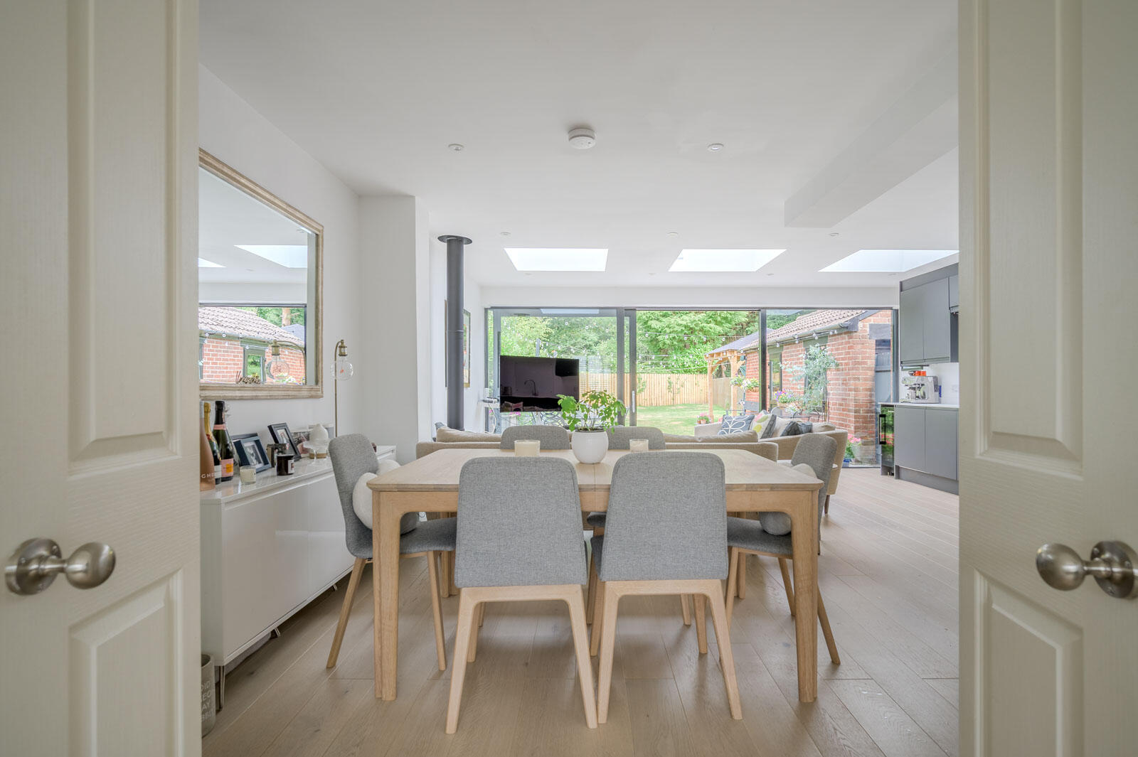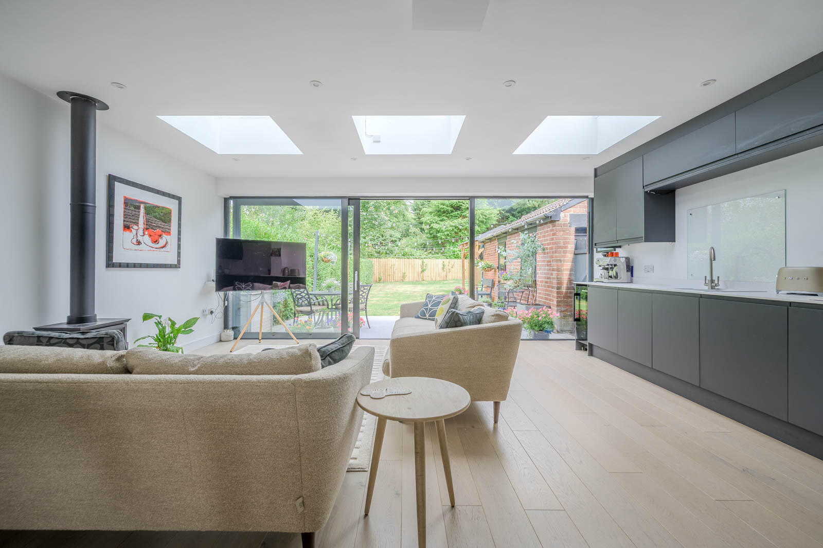 Open Plan Lounge/Kitchen/Dining Area: - 21'3" x 19'4" - Measurements at widest points. Contemporary range of handleless high- and low-level units, laminate worktop, basin and a half sink unit, brushed steel mixer tap, integrated eye level oven, integrated microwave oven, integrated induction hob and extractor fan, integrated fridge/freezer, integrated dishwasher, integrated wine fridge, integrated washing machine Feature gas stove on slate hearth, boxed skylights, column radiator, recessed spotlights, engineered wood flooring, sliding patio doors to rear garden.