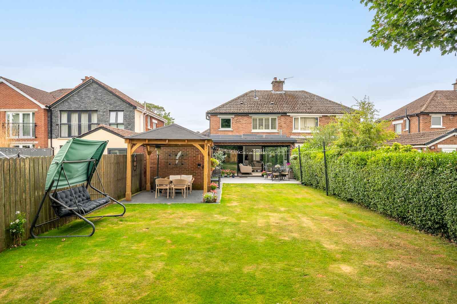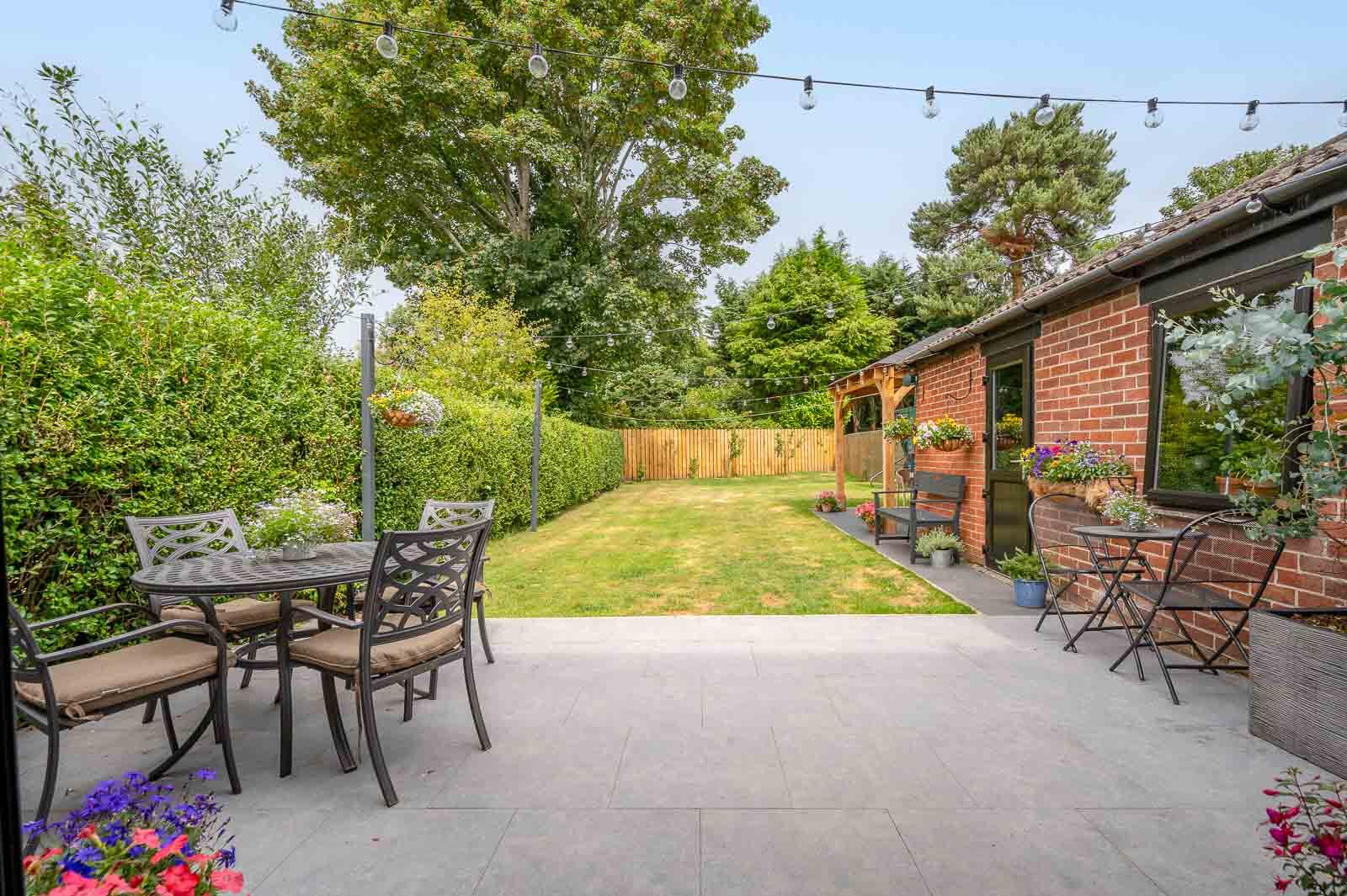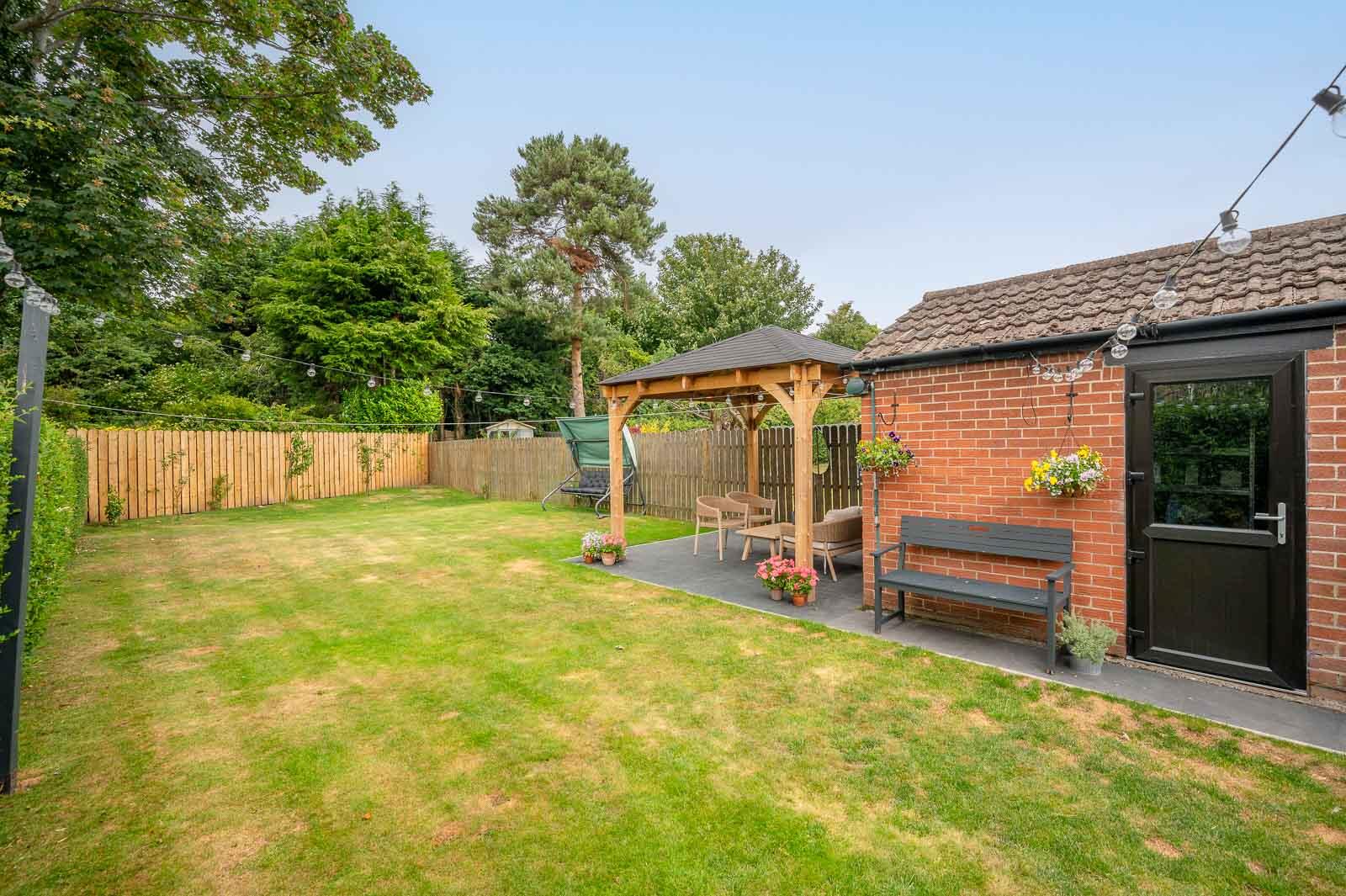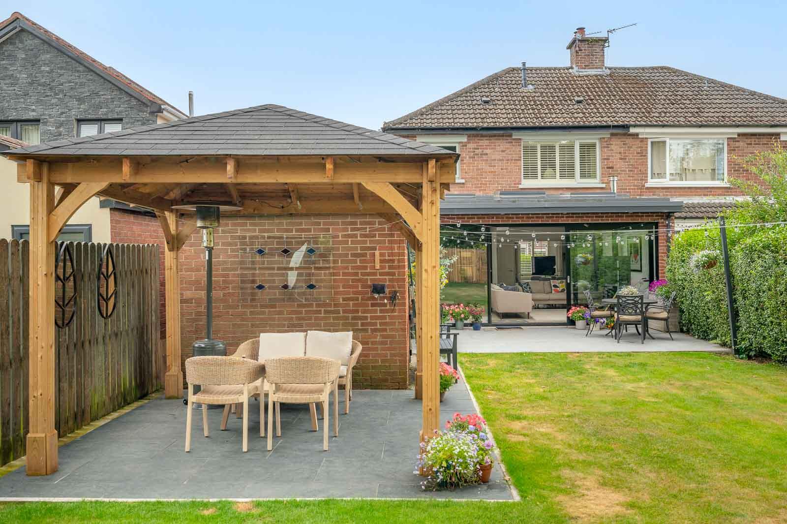 .Impressive Rear Garden, Laid in Lawn with Paved Patio Areas and Timber Pergola with Solid Roof Ideal for Outdoor Entertaining and Children at Play