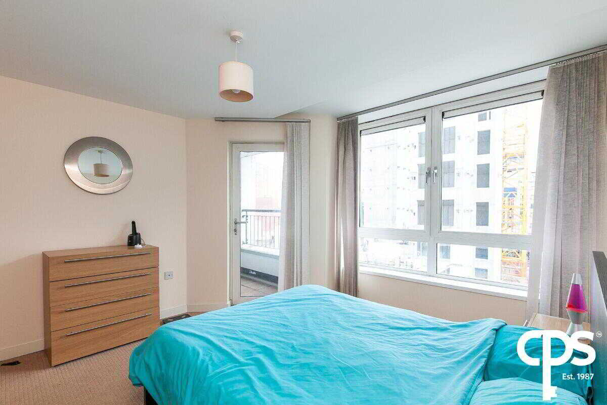 This spacious double bedroom has carpet flooring throughout and neutral décor. This master bedroom benefits from a private balcony overlooking Belfast City Centre.