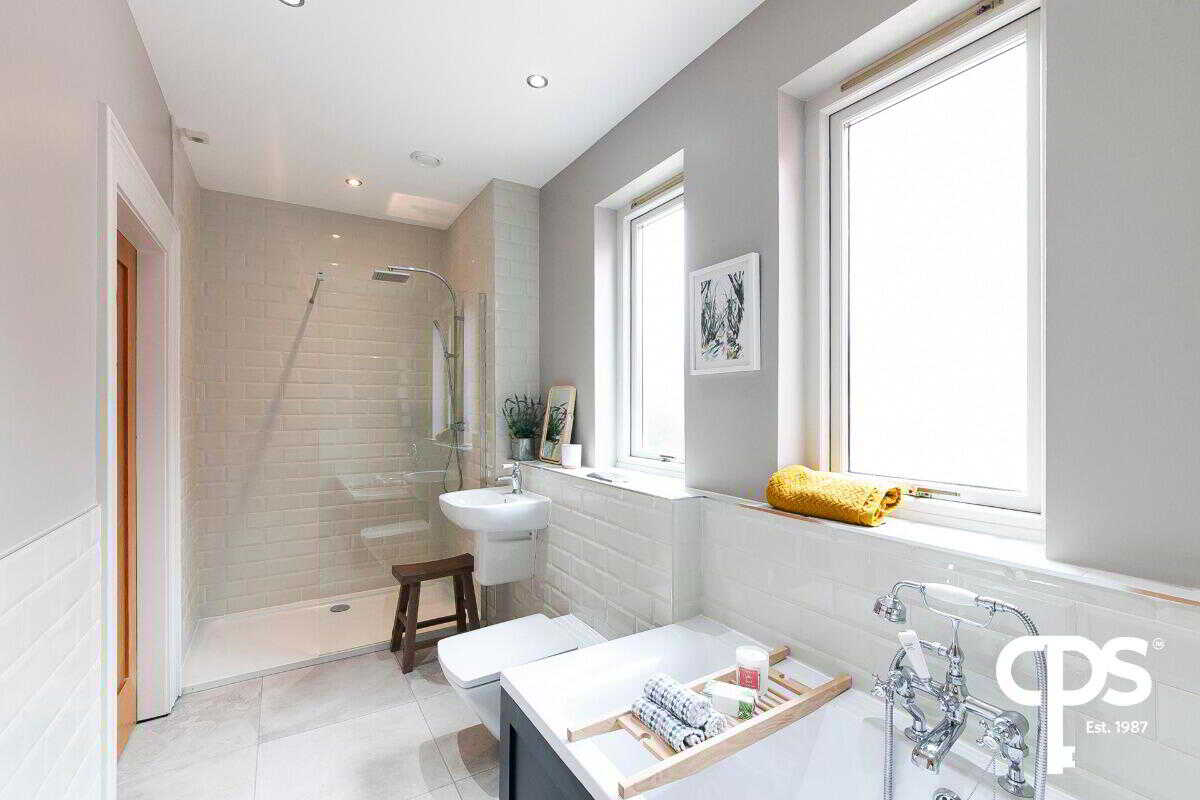 Tiled flooring with part tiled walls and a tiled shower surround. The bathroom comprises of a walk-in shower, bath, WC and wash hand basin.