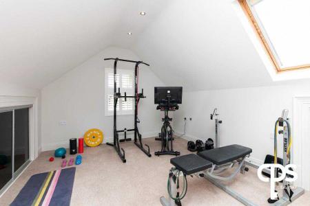 Double bedroom with carpet flooring with skylights. Currently utilised as gym.