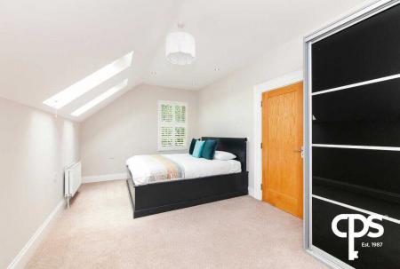 Substantially sized double bedroom with carpet flooring and neutral décor with copious amounts of natural light from the sky lights. The room offers a dressing area and ensuite bathroom.